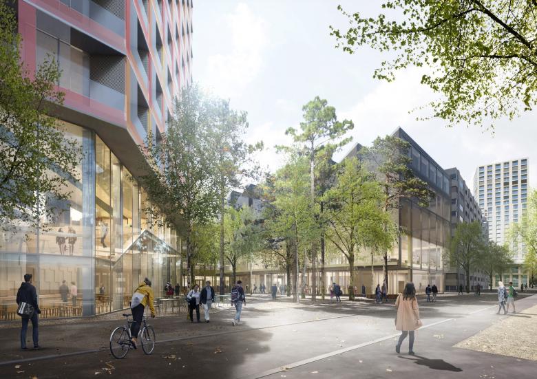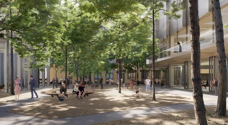 Die auf dem gesamten Areal vorgesehene Verdichtung des Grüns wird um das ganze Teilgebiet herum aufgenommen. Der neue Quartierplatz wird mit einem Hain aus einheimischen Baumarten bepflanzt, dessen grünes Dach das Mikroklima und die Aufenthaltsqualität wesentlich verbessert. Die Bäume wachsen auf einer zusammenhängenden Platzfläche mit versickerungsfähigen Belägen, die eine das Wasser zurückhaltende Schicht über der Tiefgarage bildet. Der kühlende Schatten der Bäume bietet sich für vielfältige Nutzungen an. Im Gegensatz zur extensiven Dachbegrünung auf dem historischen Gebäude wird das Dach des Wohnturms mit dichter Vegetation bepflanzt. Damit wird ein weiterer halböffentlicher Aussenraum im Schatten von Bäumen geschaffen, der zugleich als Sichtschutz gegenüber dem deutlich höheren Prime Tower dient.