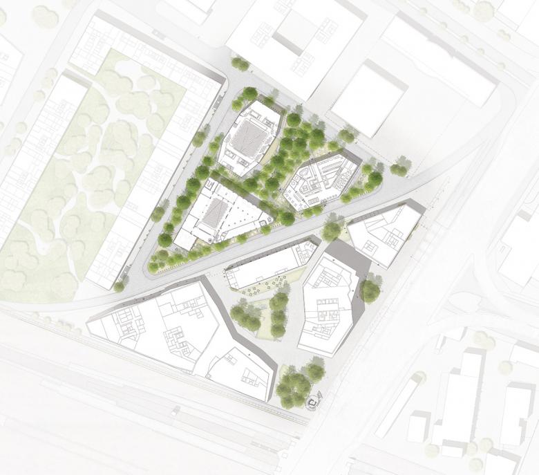 Bei der Weiterentwicklung der benachbarten Baufelder galt es, den ‹Genius Loci› des Bestands zu respektieren und gleichzeitig einen lebendigen Ort zu kreieren, der auch zukünftigen Nutzungsansprüchen gewachsen ist. Die im Rahmen eines Studienauftrags vorgeschlagenen drei Solitärbauten – ein Wohnturm, ein neues Kulturhaus und ein denkmalgeschütztes Industriegebäude – lassen einen Quartierplatz entstehen, der zum Verweilen einlädt, aber auch als Verbinder und Verteiler für den Langsamverkehr vom und zum Bahnhof Hardbrücke dient.
