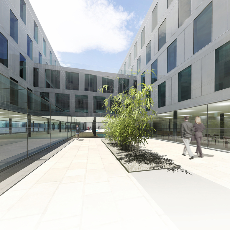 Ein vielseitig nutzbarer Platz ist gegen die Verkehrsflächen im Norden und Osten durch den Bürobau abgeschirmt und begrenzt das anschließende Wohngebiet durch einen langgestreckten Wohnbau im Westen.