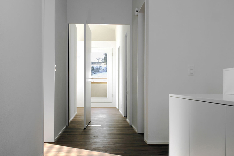 Vorbei an Büro und Bad, gelangt man über eine Niveautreppe in den Wohn- und Essbereich. Mit der Überhöhung des Wohnraums wird auf die bestehenden Terrainverhältnisse reagiert. Eine grosszügige Fassadenöffnung im Wohnbereich gibt den Blick auf die Berner Alpen frei. Im Obergeschoss befinden sich Schlaf-, Nass- und Nebenräume. Der eingezogene Balkon im Elternschlafzimmer bietet Raum, um sich zurückzuziehen. Die Teilung der Kellerräume wird flexibel gehalten, um den späteren Ausbau zu einer Wellnesszone zu ermöglichen.