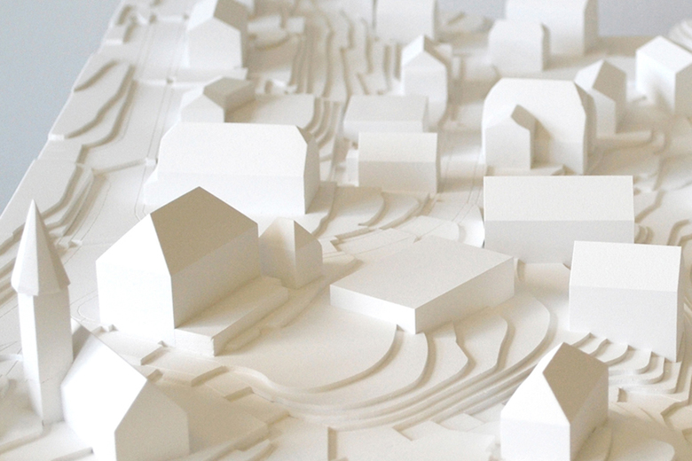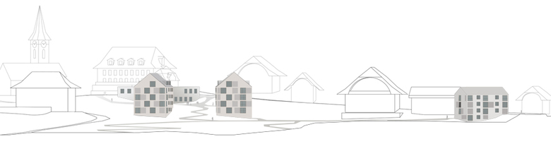 Das Zentrum der Anlage wird der Dorfplatz, welcher sich zwischen der Kirche und dem Restaurant Bären sowie dem neuen Verwaltungsgebäude aufspannt. Die Offenheit schafft einen Treffpunkt für Bewohner und Dorfbevölkerung. Ein Wiesenteppich überzieht das Areal bis zu den Wohngebäuden und bettet diese in der Landschaft ein. Locker gestreute Zierobstbäumen schaffen einen behutsamen Übergang zwischen Kulturlandschaft und Siedlung. Die Geschossdecken, Treppenläufe und Wohnungstrennwände werden in Ortbeton ausgeführt. Die Fassaden und das Dach werden in Holzbauweise erstellt und über den massiven Kern gestülpt. Die Fassadenhaut ist als vertikale Holzschalung aus sägeroher Lärche vorgesehen. Beschattung der Fenster erfolgt teils über hölzerne Schiebeläden, teils werden Stoffmarkisen eingesetzt.