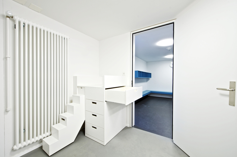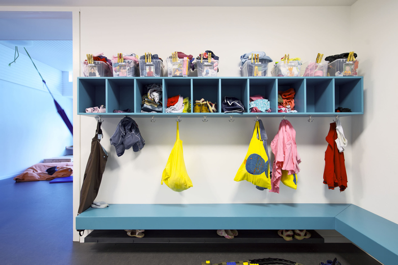 Die Decken der Aufenthals- und Spielräume sind akustisch verbessert. Sämtliche Räume sind hell gestrichen, der Boden aus dunklem Linoleum kontrastiert dazu. Einzig die neuen Garderobeneinbauten weisen zur Identitätsbildung jeweils eine intensive Farbe auf.