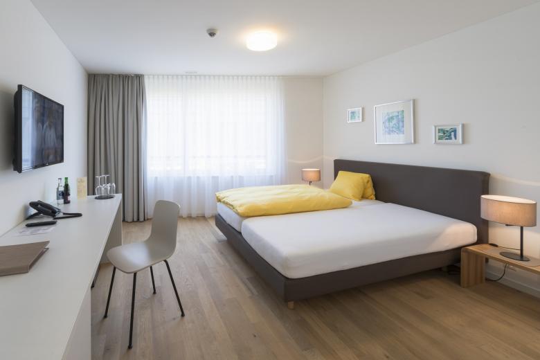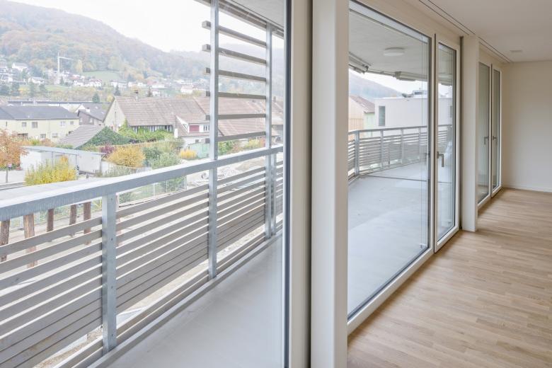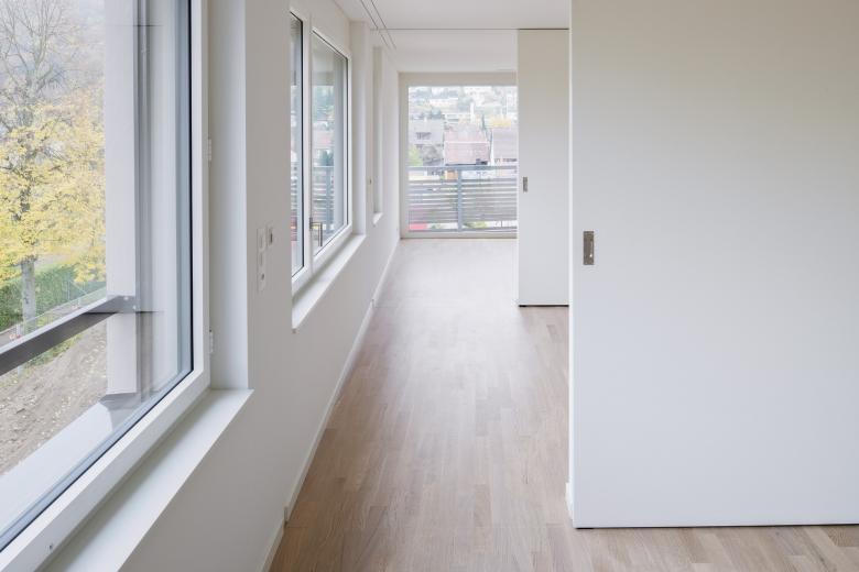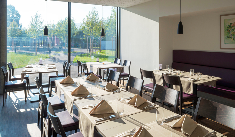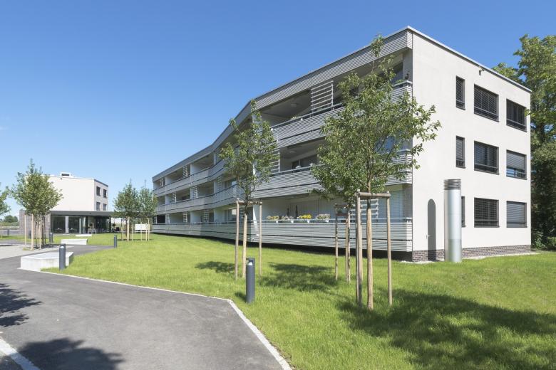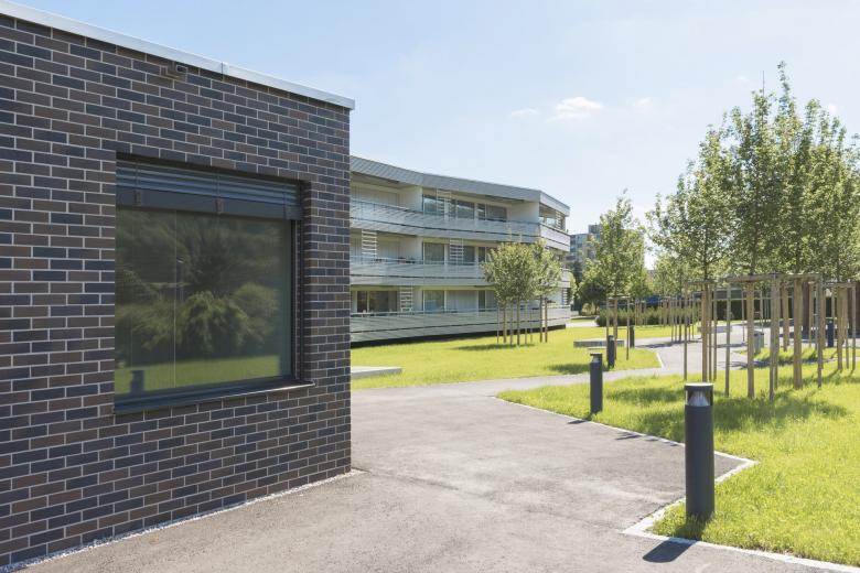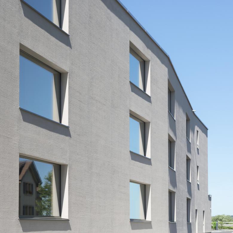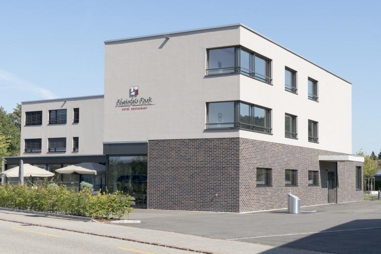Das Grundstück wird geprägt durch seine nähere und weitere Umgebung. Gegen Westen grenzt es an die stark befahrene Schaffhauserstrasse und profitiert vom Weitblick über den Rhein. Östlich wird es von einer ruhigen und offenen Parklandschaft umrahmt. Mit dem Neubau werden die zwei Hauptqualitäten aus dem Umfeld aufgenommen und akzentuiert. Der Platz gegen den Rhein hin ist Empfangsraum und leitet zum grosszügigen Eingangsbereich über, welcher die zwei polygonalen Baukörper verbindet und in den intimen Innenhof überleitet.