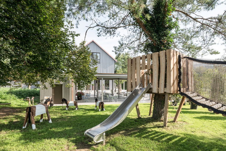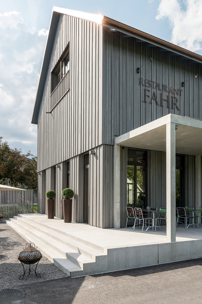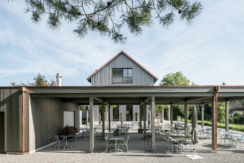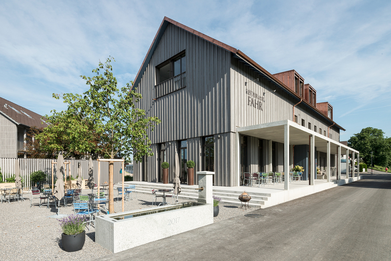 Im Ortsteil Sulz in Künten, am Rande eines Naturschutzgebietes, entstand ein Ensemble aus Restaurantgebäude und Mehrfamilienhaus. Die geschickte Anordnung der beiden Baukörper ermöglicht eine sinnvolle Einteilung des Aussenraumes: eine grosszügige, dem Restaurant zugewandte Aussenterrasse mit ca. 100 Sitzplätzen sowie einen intimen Innenhof für die Bewohner der Wohnungen. Neben statisch tragenden Elementen aus Beton wurden beide Gebäude überwiegend in Holz gefertigt und mit dem "Herkunftszeichen Schweizer Holz" ausgezeichnet.