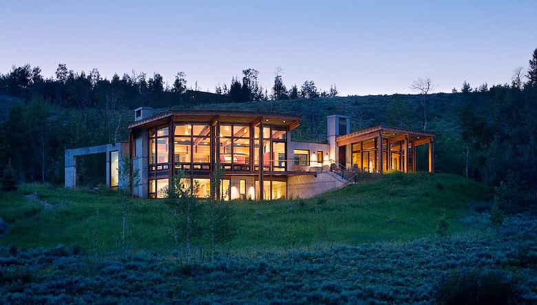 More subtle transparency occurs through honest structural elements and materials that clearly expose form. The residence’s “no-nonsense” nature is revealed in an unashamed use of exposed concrete; simple horizontal, natural-weathering, untrimmed cedar siding; and imperfect reclaimed wood. Wood and concrete flow from exterior to interior across low-profile windows, erasing the natural-to-created space distinction, while structural steel columns and concrete flying buttress-like supports visually continue interior structure outdoors.