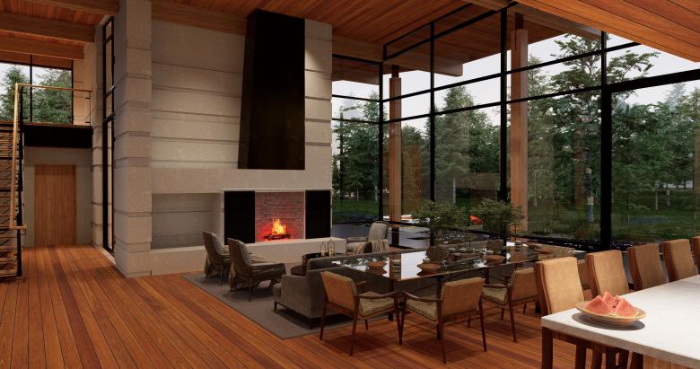 The central living area rises two stories, flanked by the master suite/ exercise/ yoga area to the north and the garage/ guest suites to the south. With unobstructed views of the east and west, this living space captures the ever-changing beauty of the mountains.