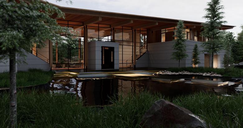 Board-formed concrete plinths create a maintenance-free base for the second floor areas, while sod roofs furnish them with inviting terraces. Small sections of cedar siding bring warmth to the material palette, while hardwood floors, natural stone, and cedar ceilings transfer the warmth into the interior spaces. Ground level terraces extend the living areas beyond the confines of the house. While water from the abundant aquifer is used for a water feature encircling the home.