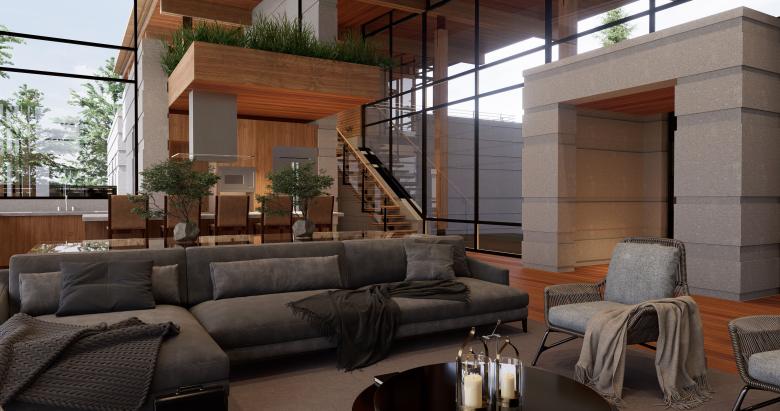 Taking cues from existing tree canopies, a large floating roof extends from the interior to the exterior terraces, suspending the roof line high above the structure to provide abundant shade without cropping views. Prominent mountain ravines inspire the roof’s distinctive shape, as the roof splays outward, mimicking the imposing form of the topography. The roof is supported by a series of glu-lam beams with composite steel & glu-lam columns, creating a remarkable canopy effect both inside and out. Large steel frame windows reach from floor to ceiling, inviting views in and granting a sense of weightlessness to the roof.