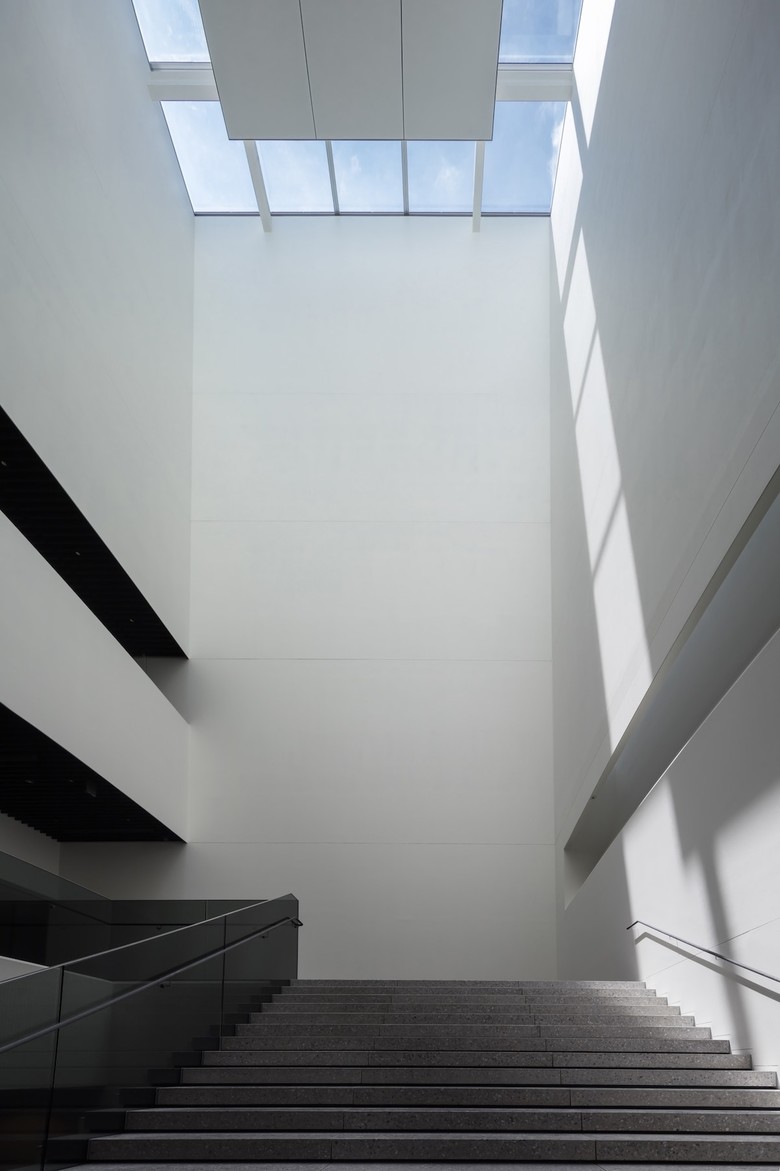 The atrium has the ceiling height reaching over 25 meters and exposed solely to the sky above through the skylight. It presents such a contrast to the relatively low ceiling of the entrance hall on the ground floor, and the lights in this such a bright, light filled space change constantly like a sun dial following the movement of the sun.