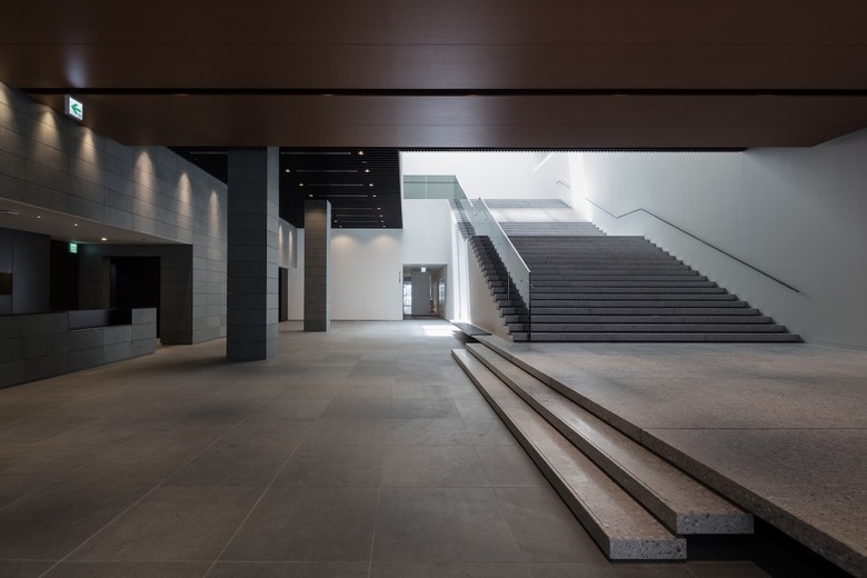 This is a convention hall located in Naka-ku, Nagoya City. It is built on an approximately 1,500 square-meter site, on top of the station where two main subway lines cross, and facing two roads: main road on the north side and a neighborhood road on the south. It was required to show “two faces” for this building. The facade on the north side facing the main road is its face as convention hall with a capacity to accommodate over 600seats. On the south side is its face as a commercial building with a café on the ground floor and spaces above for future tenants. So the building was designed with a distinctive difference in the two faces facing north and south.