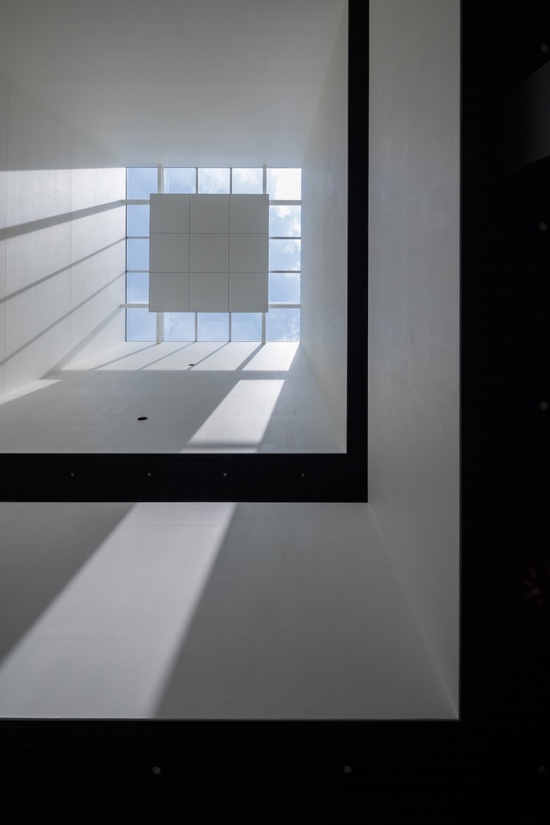 First, visitors will enter inside by meandering through the two floating, semi-transparent glass screens. The entrance hall is designed as a space with controlled natural light coming in, thus slightly dim. There and then, the grand staircase appears, connecting to the main area on the second floor. As the visitors climb up the stairs, they are met by all the natural light shining through the skylight, placed at the top of atrium, high on the second floor.