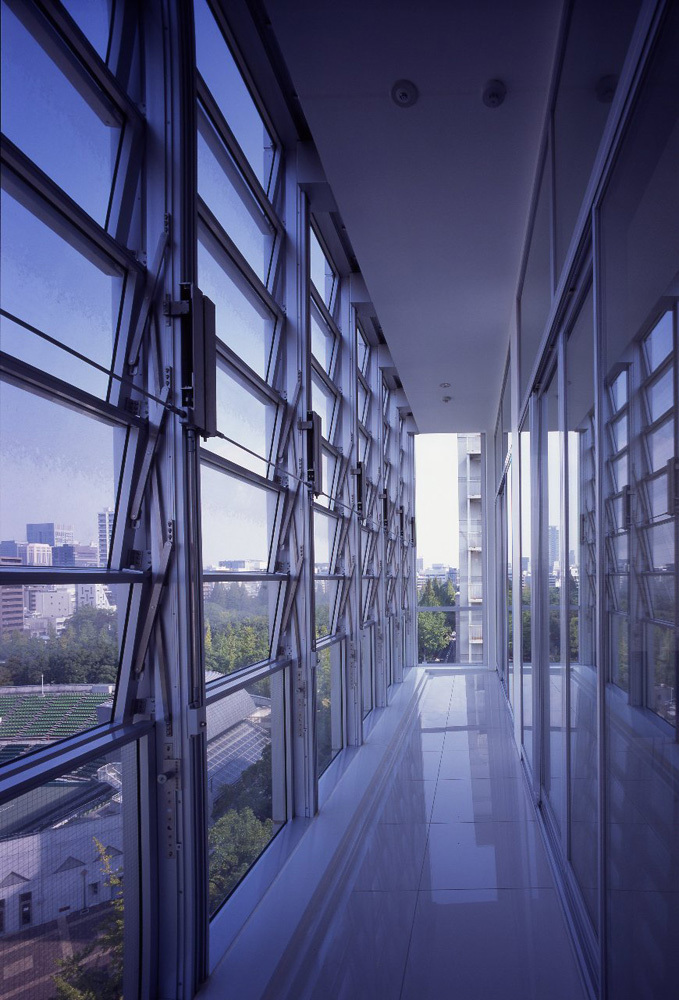 One of the main features of this housing complex is its double-skin structure consisting of glass louvers and sliding sashes that covers the facade of the building on the park side. As the high-rise affords a view of such splendid scenery, with the city and the park stretching into the distance, we wanted to avoid large fixed sheets of glass stretching from floor to ceiling that would require around-the-clock air-conditioning. Instead, we set out to create a dwelling that would allow its residents to enjoy the change in seasons and fresh air. This led to the development of the double-skinned facade with its glass louvers and sliding doors. By opening and closing the two glass panels in the middle room, which we named the "Sun Room," the user can continuously change the character of the residence – both its interior and exterior.