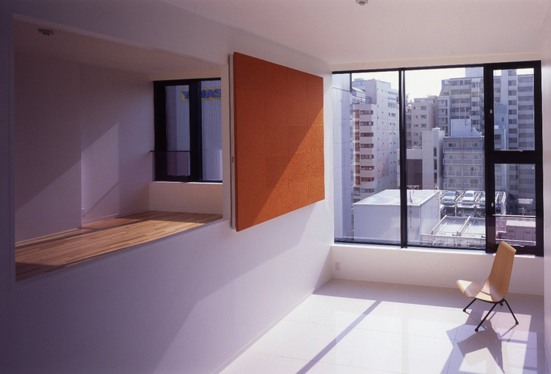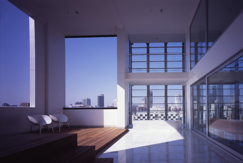 The north side of this lot, located in the center of Osaka, faces Utsubo Park, an oasis of nature in the heart of the city. After first determining the maximum volume afforded by the lot, we set to work on an interior based on the largest floor space allowed by law. In our preliminary studies, we found that there was an ample amount of void space in terms of both height and width to create an outside area in the limited volume. The design for basic units are composed by a combination of two units with an L-shaped cross section, the ceiling of which is nearly 3.5 meters at its highest point and 2.5 meters at its lowest. In addition, we could create one floor unit with a ceiling height of 3.2 meters, another unit expanding horizontally with a two-layered stairwell and terrace, and a courtyard-equipped unit, for penthouses.