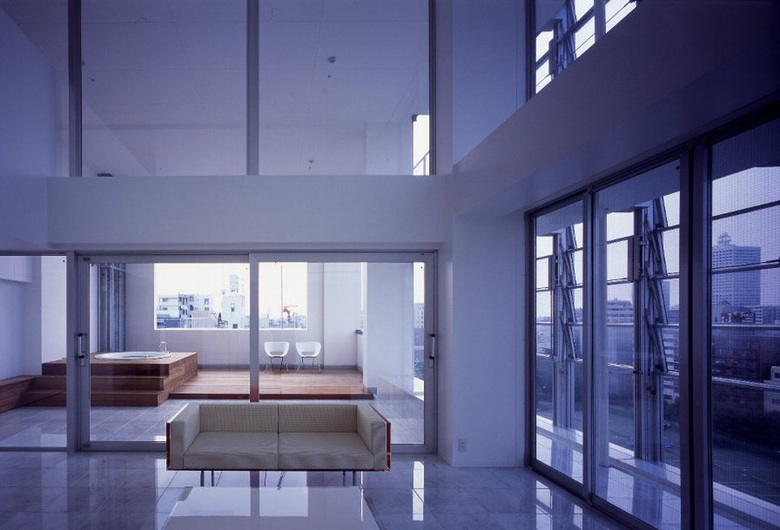 Another important feature is that by dividing the standard units on the intermediate floors from the penthouse units, we attempted to imbue each space with its own distinct character. In the standard units, which are situated closest to the greenery of the park, extending to the north, the main interior feature is the height differential within the space. While in the penthouse units, which afford a view of the urban skyline, there are exterior spaces, such as a floating terrace and courtyard, which are exclusive to a high-rise residence.