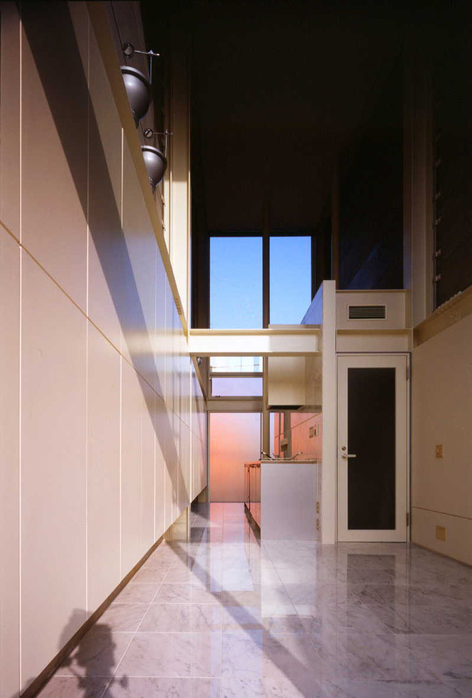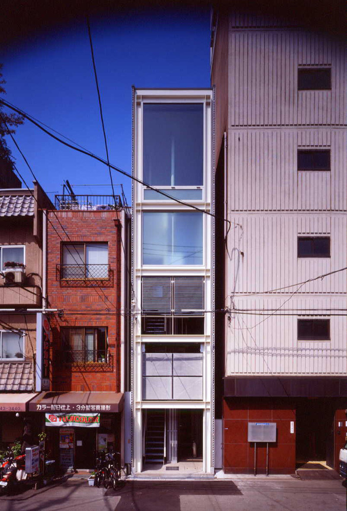 This house was built on an extremely small plot of land in downtown Osaka. Measuring 2.5m, the facade of the building fills the entire front of the site. The house is 13m deep, and as for the lower three floors ceiling heights were kept as low as possible. This construction is topped by the upmost floor, where the dining room is located. With a 6m-high ceiling, the dining room occupies as much as two-thirds of the entire building plan; the remaining third of the depth is filled by a terrace as an open-air space. As a result, the entire structure reverberates the depth of the small-breasted site, as well as emphasizes the vertical direction. The building features two main topics. One is the verticality of urban life. The other one is the creation of a floating living space the top floor, separated from the din of the street and close to Nature. For all this, no more was needed than a few square meters of terrace space and about 30 square meters of building space, including the generous dining room. What I tried to do in designing this house was to give new meaning to the concept of a rooftop garden.The building at once provides the sensation of a privileged view and a unique feeling of being afloat. This, I think, is the precious quality that would not be without the modern concept of space, or more specifically: the rooftop garden.