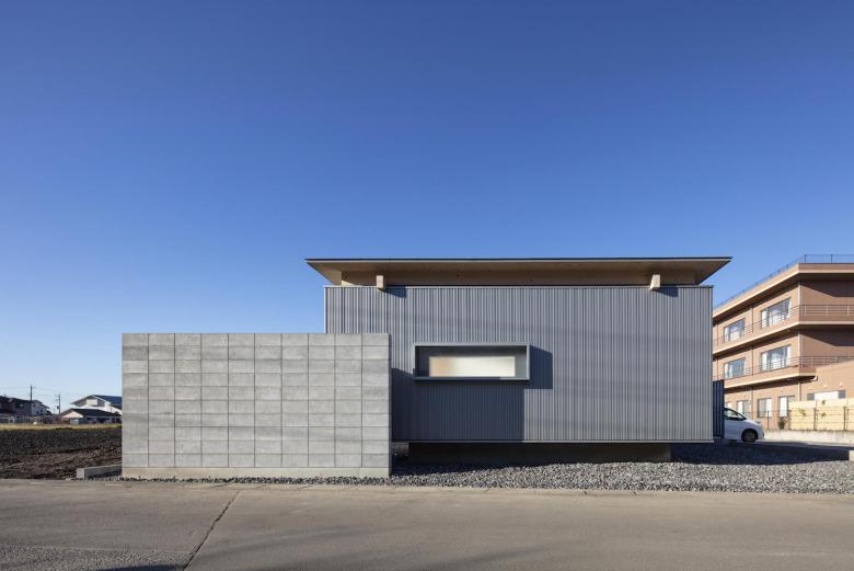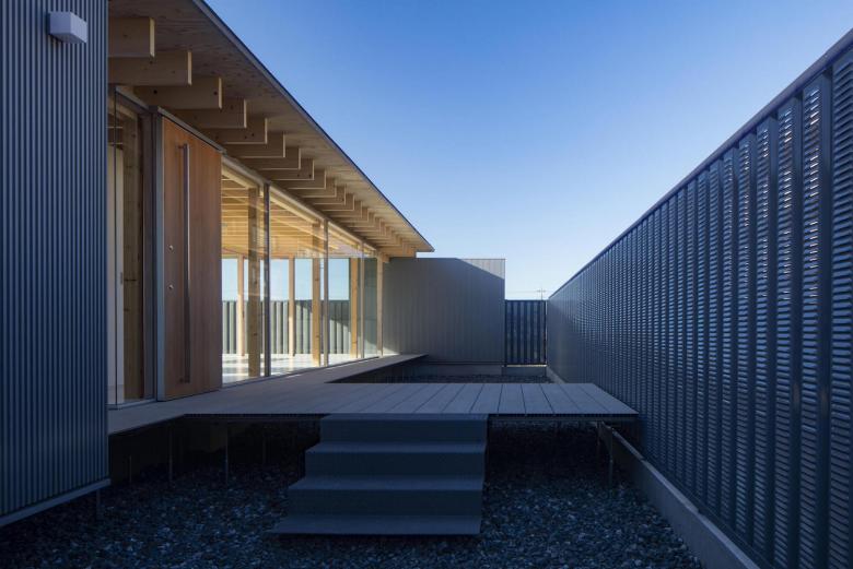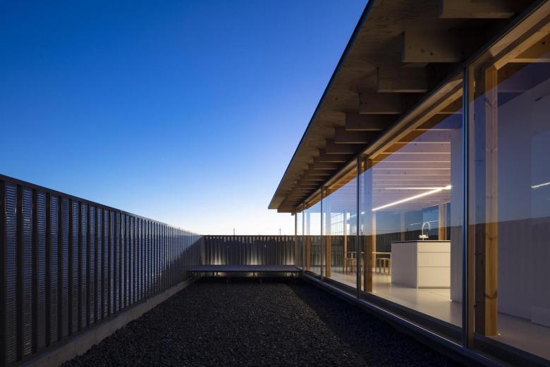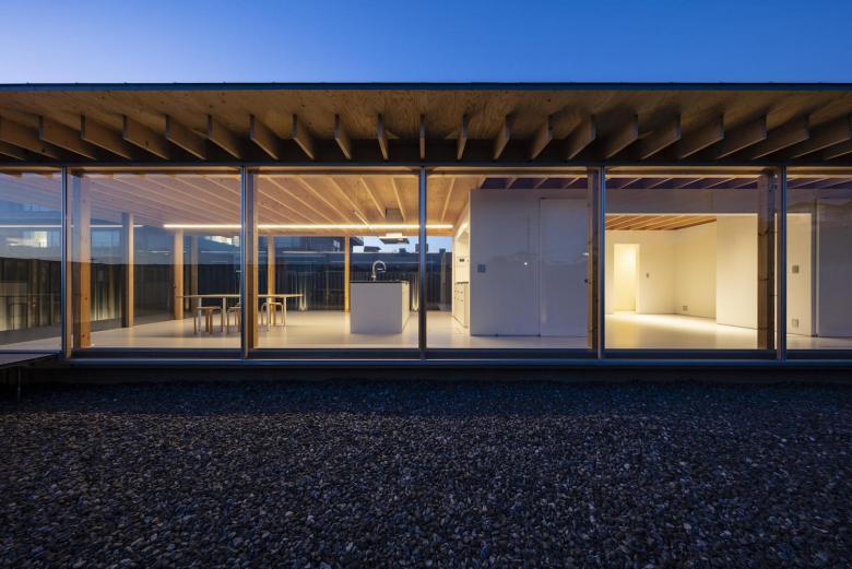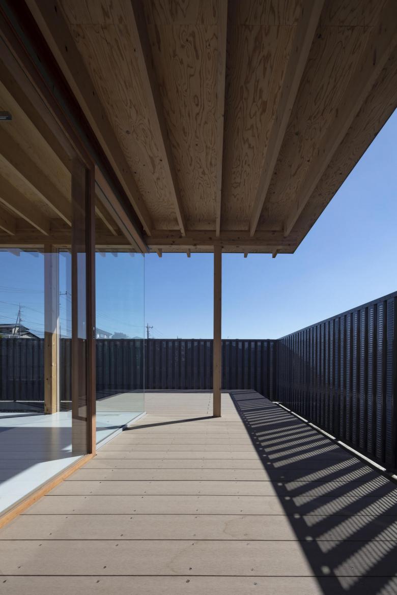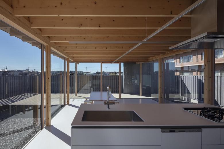 In a place like this, a single-story house with an open floor plan seemed to make sense. Considering changes in the surrounding environment and the urbanization that might occur in the future, we determined that a somewhat contradictory mix of a half-closed open-plan would work in this mundane rural landscape on the outskirts of Tokyo. A semi-transparent metal fence surrounds the house’s perimeter blocking the view from outside, while the house’s exterior walls are transparent glass. The space in between that could not be quite described as a garden, functions as a buffer space for the changing of the environment in the future. Thus we designed, in a broader sense, an open-plan architecture with a double-skin. The house is a wooden structure with rafters as the main structure, while other elements, including the exterior deck and the fence, are constructed with mass-produced materials to ensure high performance. We aimed to create an interior landscape with the contrast of the wooden structure and industrial products.