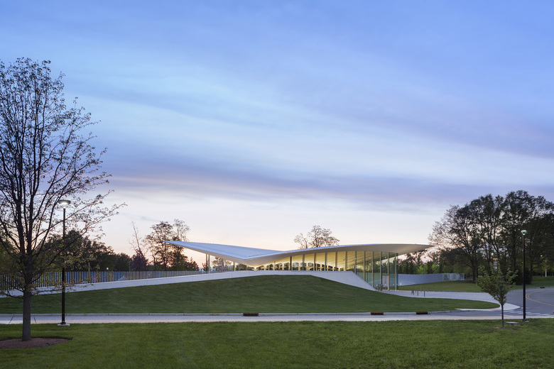 The Visitor Reception Building for Novartis' North American Headquarters presents a dynamic new gateway to the campus. The building emerges from the earth and includes a sequence of reception, orientation, and gathering spaces for the campus. Above, the sculptural roof form with its pleated structural ceiling expresses Novartis' spirit of technological innovation. A solar array canopy at the parking area provides a welcoming introduction to the Novartis Campus and contributes to the building's LEED Gold status.