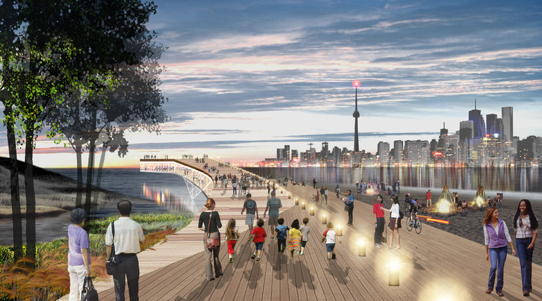Organized around the newly designed meandering Lower Don River, the naturalized river creates wetlands and habitats for avian and aquatic species and creates opportunities to engage the water through kayaking and fishing. New public spaces are linked along the southern bank of the Don River Meander and lead to a boardwalk and pier outlook that will become a focal point of the park, providing a new vantage to view the Toronto skyline and creating a year-round setting for festivals and events. A new bi-level bridge and a network of public transit lines, parkways, local roads, bicycle trails and an extensive system of pedestrian paths increases access to the city, the park, and the surrounding communities.