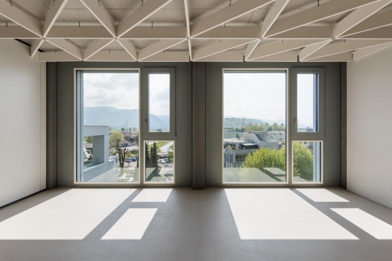 Im Erdgeschoss, zum Ochsenplatz ausgerichtet, befindet sich das Bistro Öxli. Über eine einläufige Treppe oder den Lift erreicht man die Obergeschosse. Dort sind Einzel- und Grossraumbüros untergebracht. Wie die Fassade besticht auch der Innenausbau durch seine Schnörkellosigkeit: Sichtbeton, Wandverkleidungen aus Fichtensperrholz, Deckenbaffeln aus recyceltem Einweg-Plastikflaschen und geschliffene Anhydritböden bilden eine minimale Grundausstattung und erzeugen ein angenehmes unprätentiöses Arbeitsambiente. Die ansonsten dezente Farbgebung wird an wenigen Stellen bewusst von einem Farbakzent unterbrochen, am augenfälligsten im Treppenhaus, wo Treppengeländer und Türen in einem dunkelroten Farbton gestrichen sind, man könnte auch sagen in ochsenblutrot…