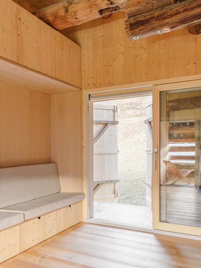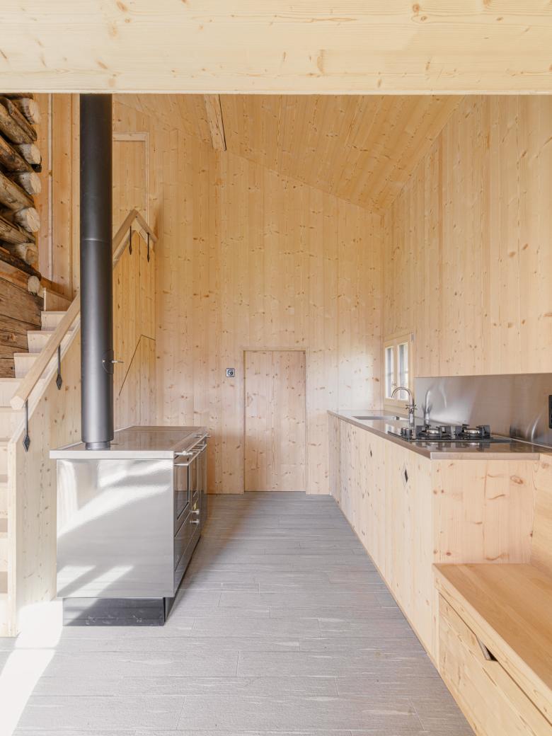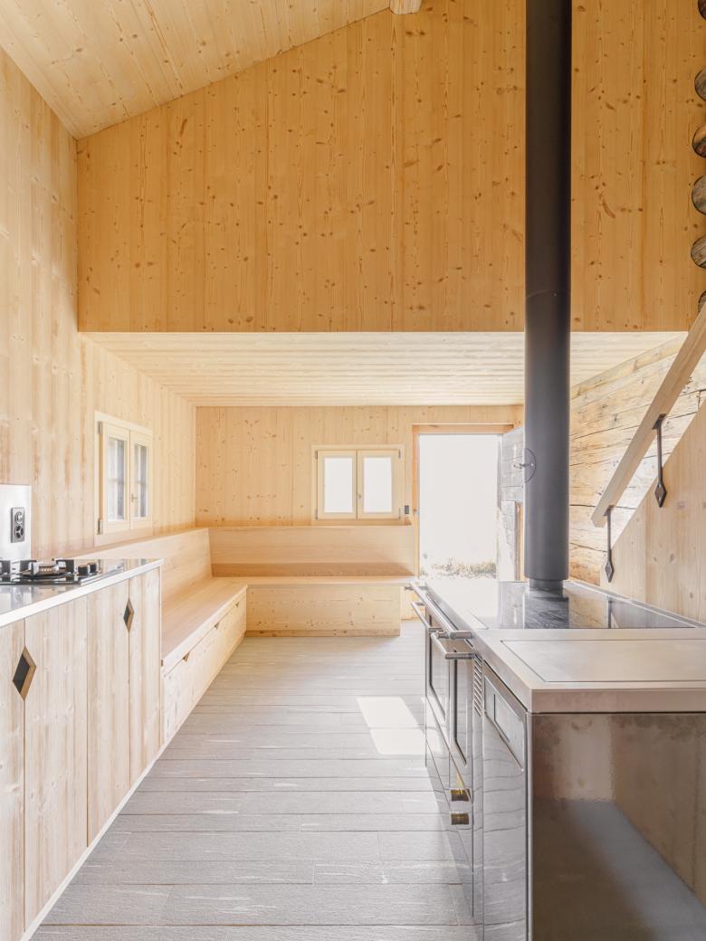 Die neuen Wände, Böden und Einbauten in hellem Fichten- und Eichenholz bilden einen reizvollen Kontrast zum bestehenden dunklen Altholz des Strickbaus. Gezielt platzierte Fensteröffnungen holen das Bergpanorama ins Innere. Die Fassaden wurden teilweise neu eingekleidet und mit einer integrierten Photovoltaikanlage an der Westfassade ergänzt. Geheizt wird über den zentral positionierten Ofen, welcher über eine Stückholz- und Holzpelletfeuerung betrieben werden kann.