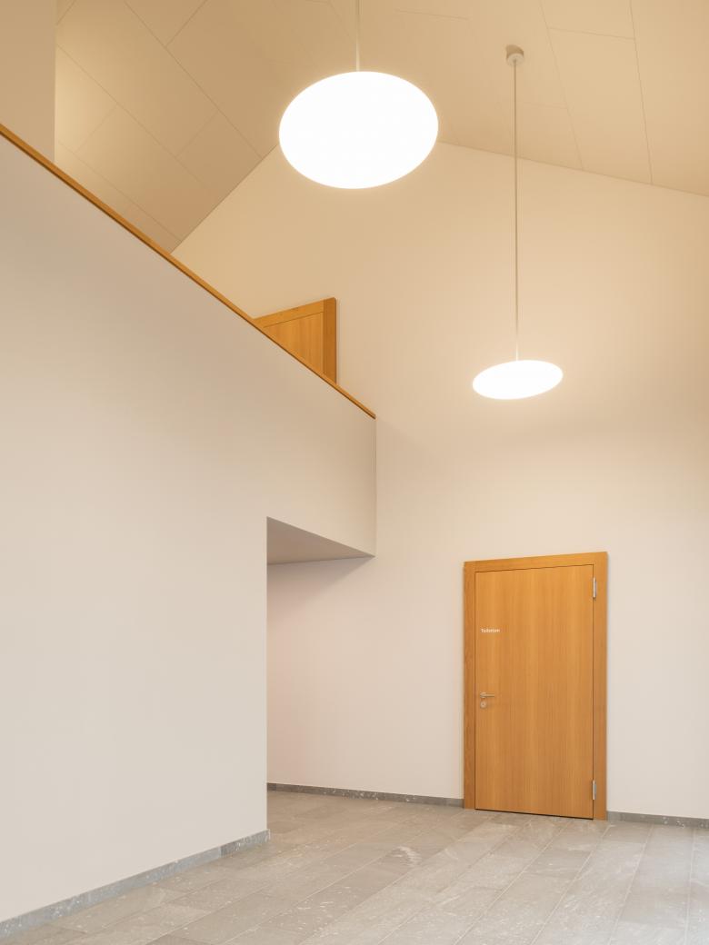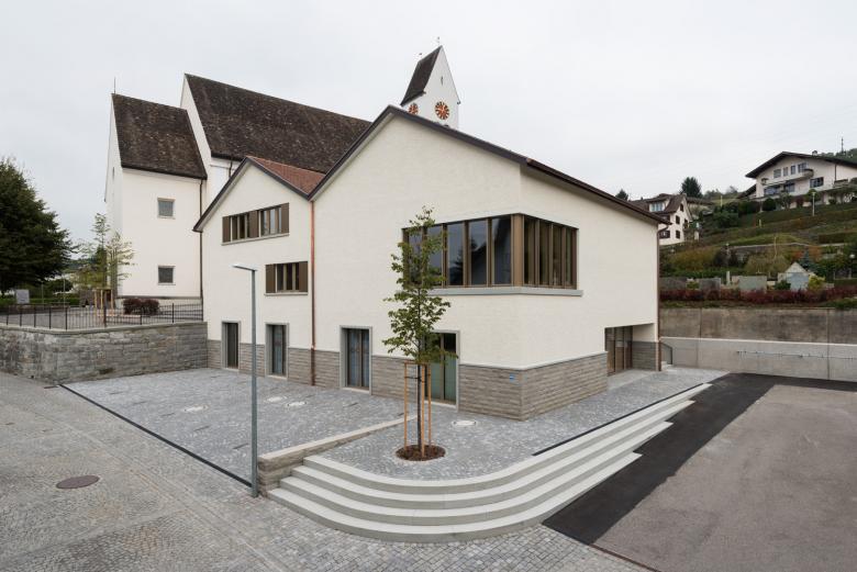 Als verbindendes Element zwischen Dorfkern und hangseitigem Friedhof nimmt das Pfarreizentrum den Niveausprung im Gelände geschickt auf, wodurch sowohl der kirchenseitige Zugang wie auch der Eingang auf Dorfniveau ebenerdig möglich sind. Herzstück des Gebäudes ist der Gemeinschaftsraum. Mit seiner Überhöhe, dem markanten Dachtragwerk und der stilvollen, rundumlaufenden Wandverkleidung aus Eichenholz strahlt der Raum eine festliche Atmosphäre aus. Ungeachtet des flächenintensiven Raumprogramms gliedert sich das Pfarreizentrum in die kleinteilige Typologie der umliegenden Wohnhäuser ein. Doppelgiebel, symmetrische Disposition und kleinteilige Befensterung entsprechen dem schützenswerten Dorfbild. Ebenso stellen der Kellenwurfputz, die Farbgebung und der Sockel aus einheimischem Sandstein einen Bezug zum gebauten Umfeld her.