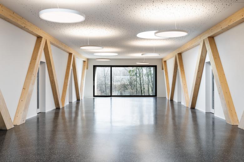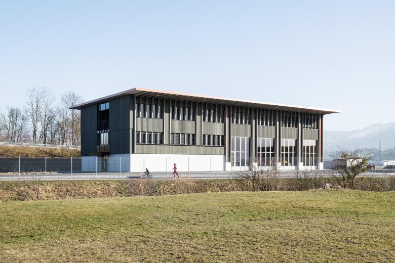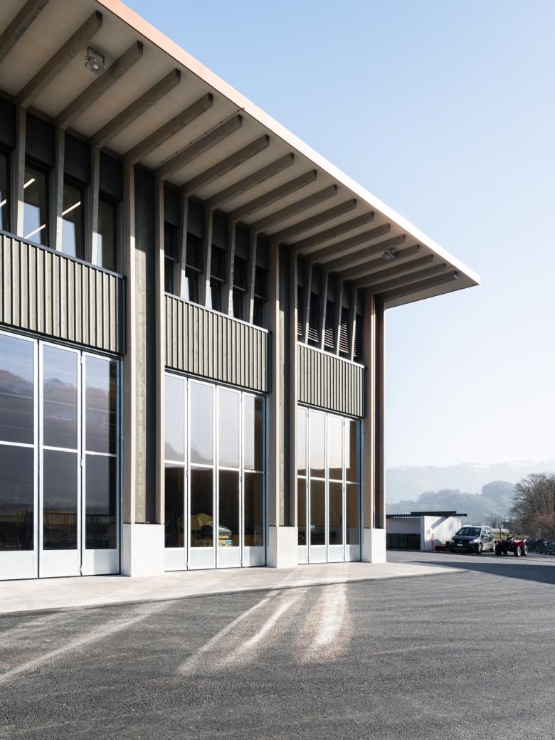 Tragwerk und Fassadenverkleidung sind komplett aus Schweizer Holz gefertigt. Lediglich das Treppenhaus ist aus Stahlbeton erstellt. Das Rückgrat bilden zwei 24 Meter lange und 6.5 Tonnen schwere Holzfachwerkträger, die im Erdgeschoss die Einstellhalle längs überspannen. Nichts Überflüssiges, kein Firlefanz – die Schönheit ergibt sich aus der Reduktion aufs rein Funktionale. Dadurch strahlt der schlichte, prägnante Bau Präzision und Klarheit aus.