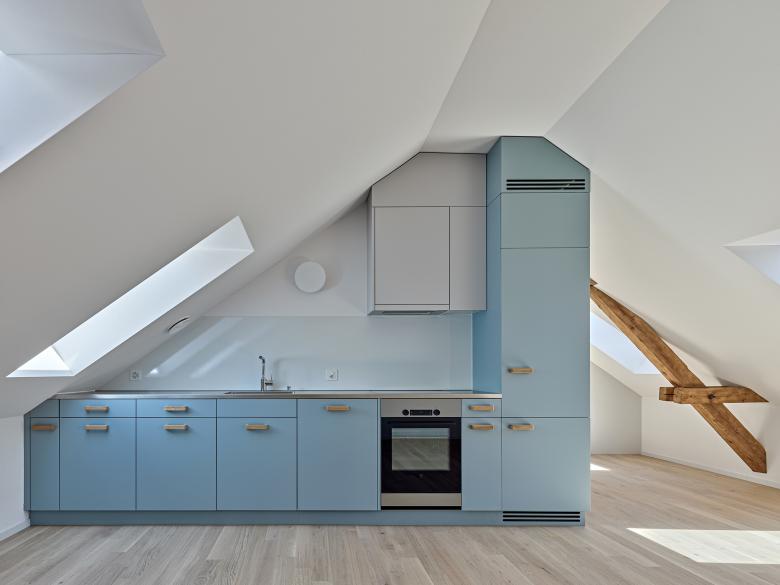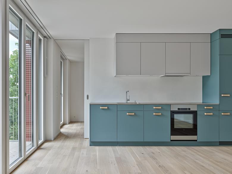 Jeweils vier Wohnungen sind pro Geschoss vorgesehen. Zwei Familienwohnungen besetzen die Ecken des Blockrands und profitieren somit von einer dreiseitigen Ausrichtung. Dazwischen werden zwei altersgerechte Kleinwohnungen angelegt.