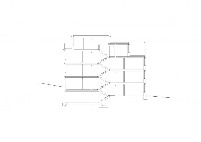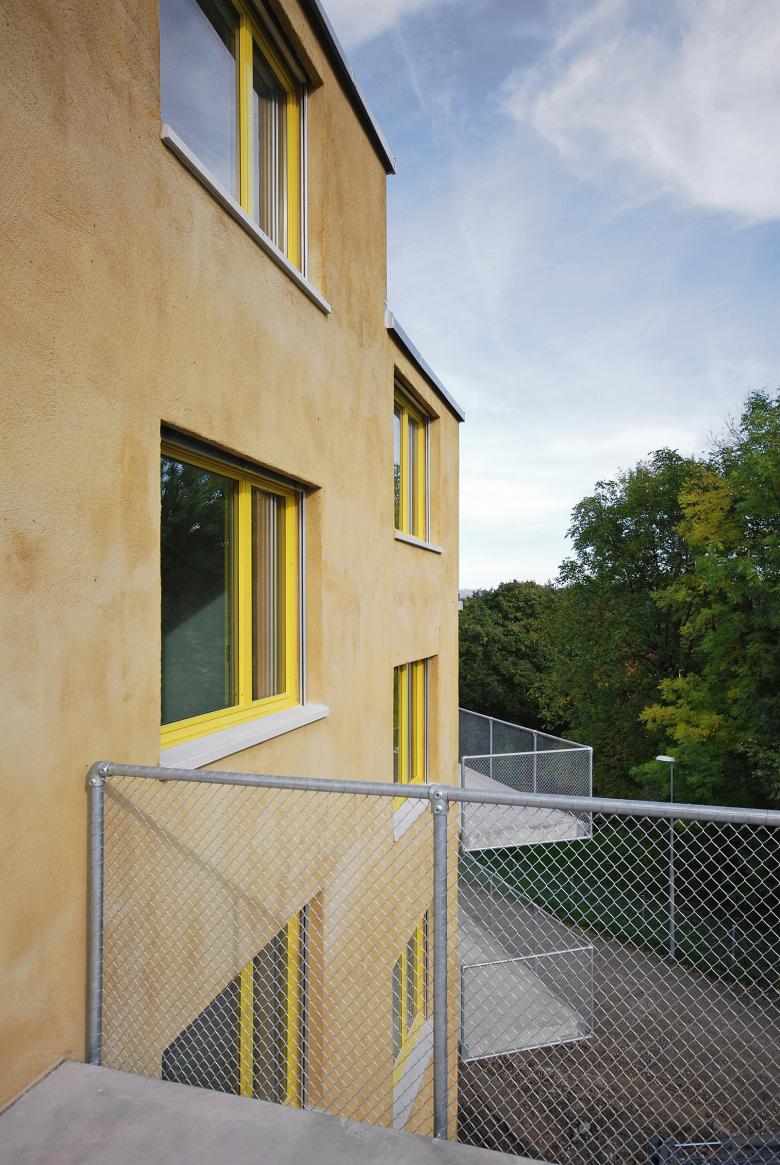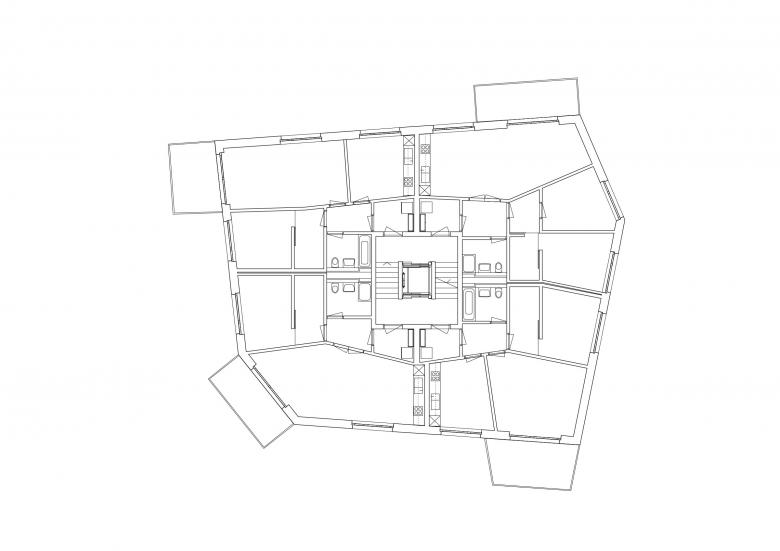 Die Anordnung der hochinstallierten Räume um den Treppenkern folgt der Absicht, die hauptsächlichen Aufenthaltsräume Essen, Wohnen und Schlafen peripher von den allenfalls für die Betroffenen störenden Installationen abgewandt an die Fassade legen zu können.