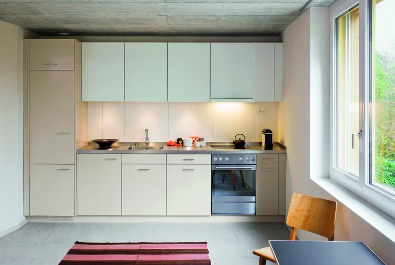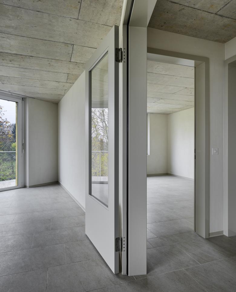 Der Grundriss der Wohnungen folgt spezifisch den Bedürfnissen der Betroffenen: Über eine separat entlüftete Schleuse mit Garderobe und Waschmaschine gelangt man in eine Diele, welche alle weiteren Räume der Wohnung direkt erschliesst.