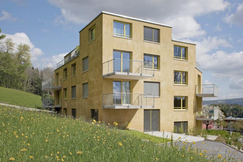 Ein Kernthema des Entwurfs ist die Materialisierung, welche weitestgehend mineralisch gewählt wurde, um zu gewährleisten, dass möglichst keine Beeinträchtigungen der Mieter entstehen können. Um eine Verzerrung des natürlichen Erdmagnetfeldes ausschliessen zu können, ist erstmals im Wohnungsbau ein Haus grossmehrheitlich mit Glasfaserstäben armiert worden. Die Erschliessung mit den haustechnischen Medien ist konzentriert angeordnet, genauso wie Nasszellen und Küchen, welche ebenfalls negative Einflüsse auf die Bewohner haben können.