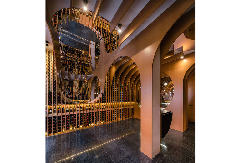 Finally, to complete the space, it is necessary to mention the different materials. There are three materials in this project: wood is used for the ribs system as the barrels, stone for the floor as the antique cellars, and the mirror material which generates amplitude and an atmospheric world of reflections where those circumferences seem to contain some kind of liquid.