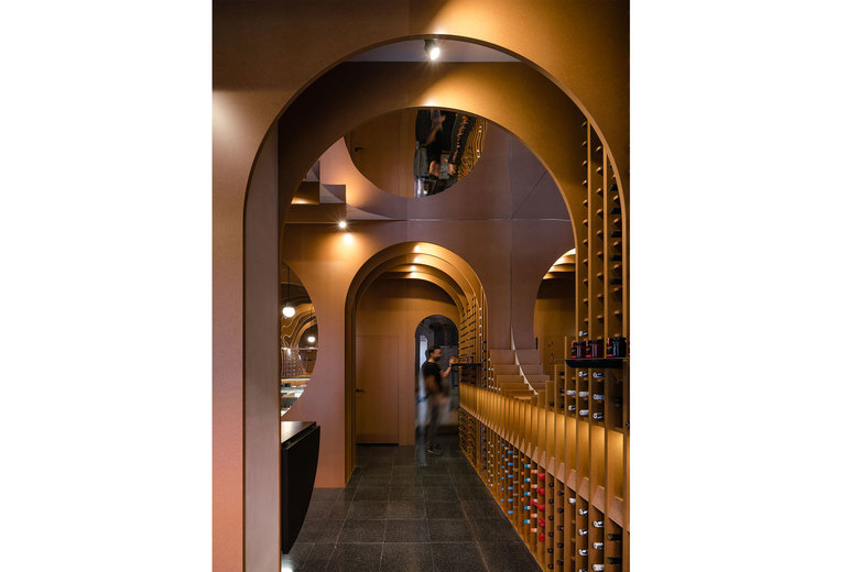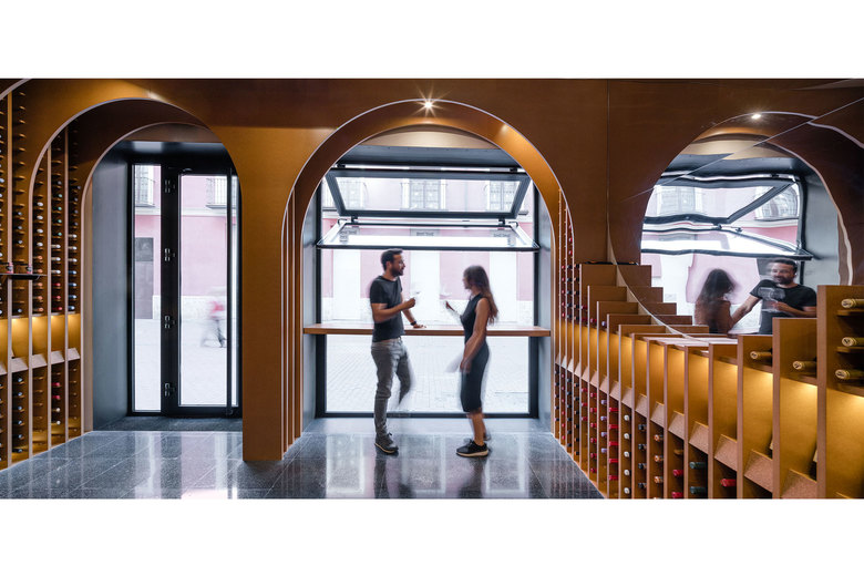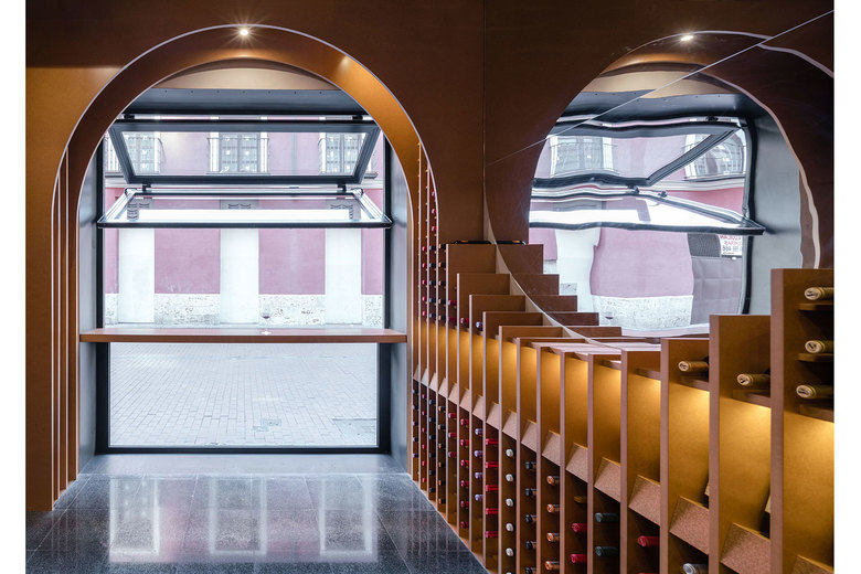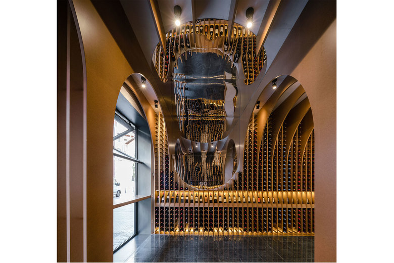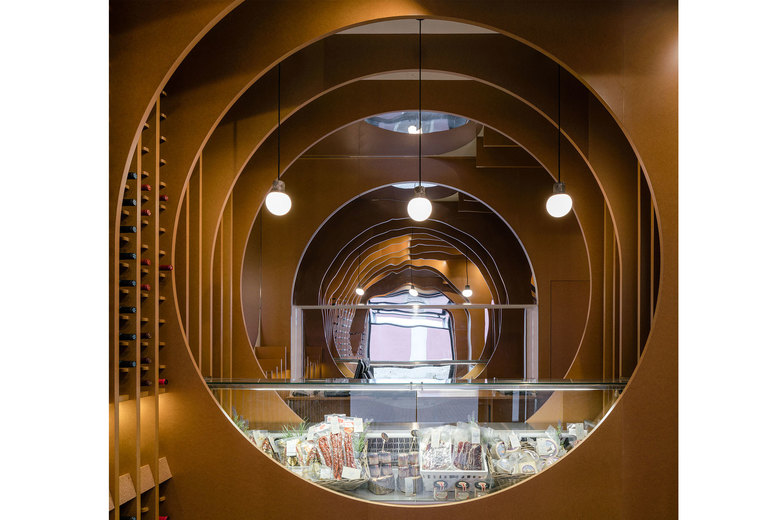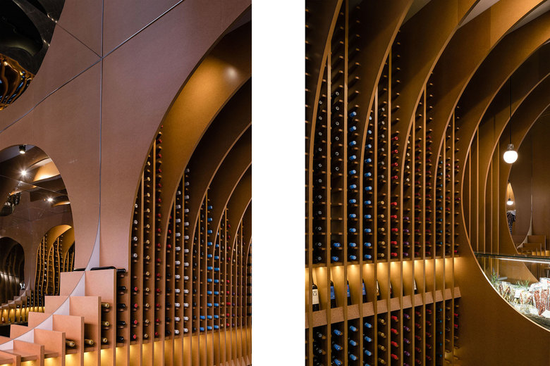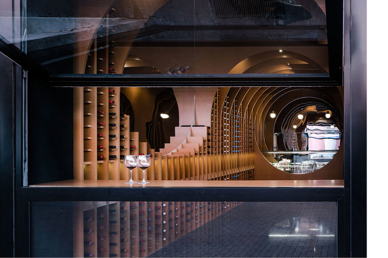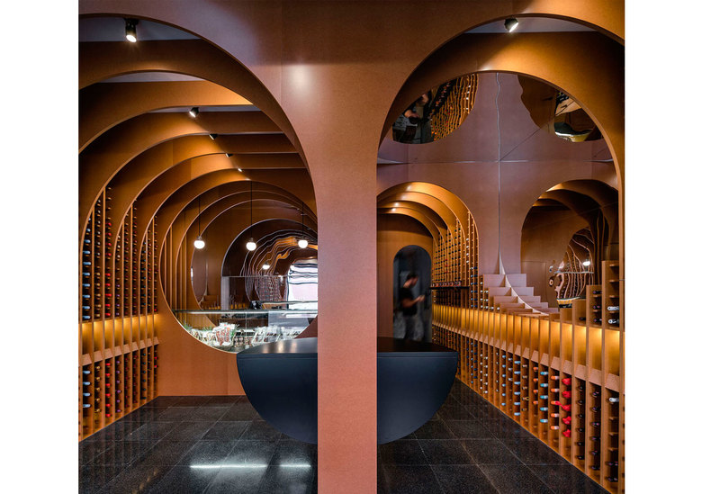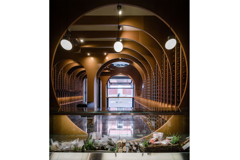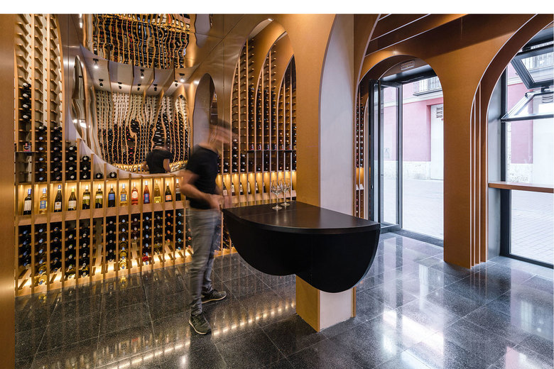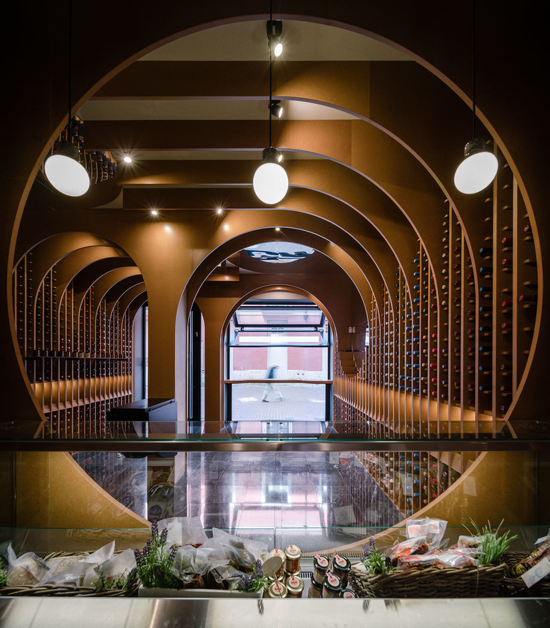 The juxtaposition of several circumferences in transversal and longitudinal direction of the local creates a space where the required situations appear such as the counter, tasting table and exhibition-sale space.