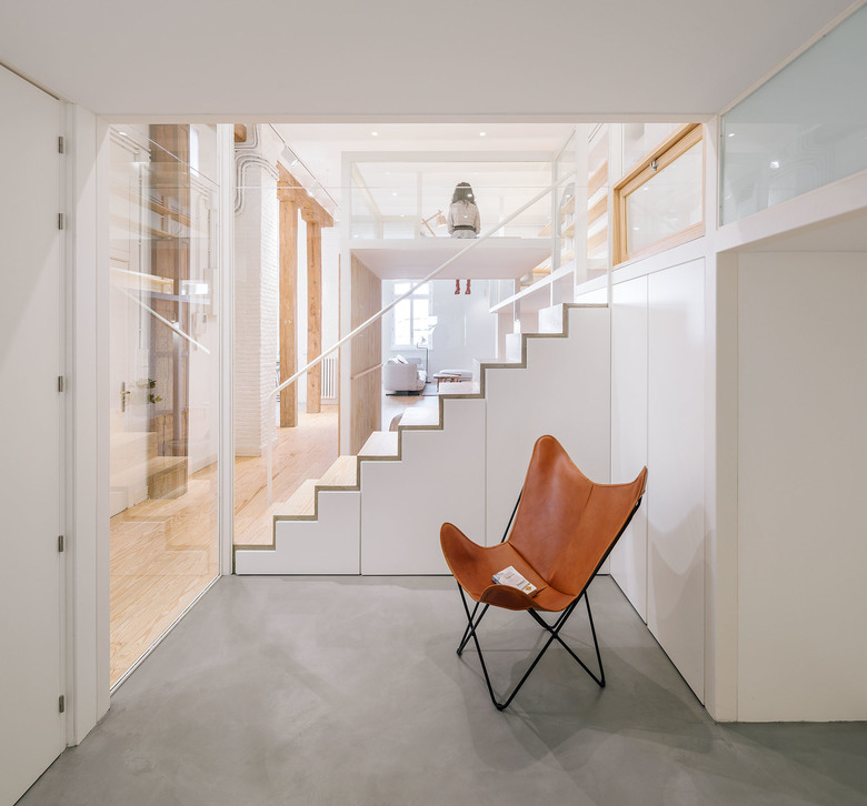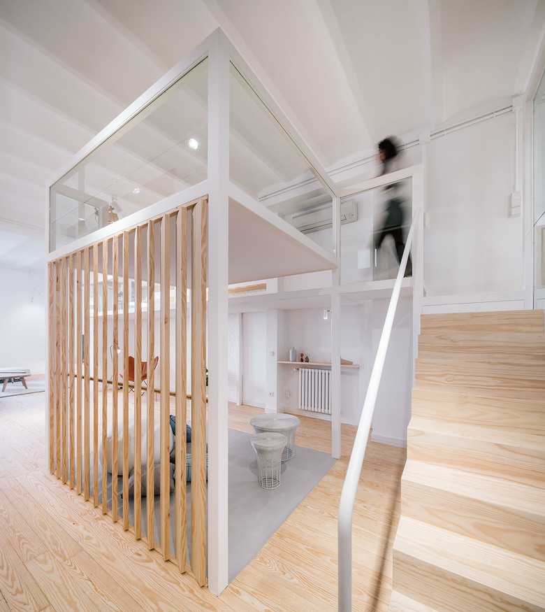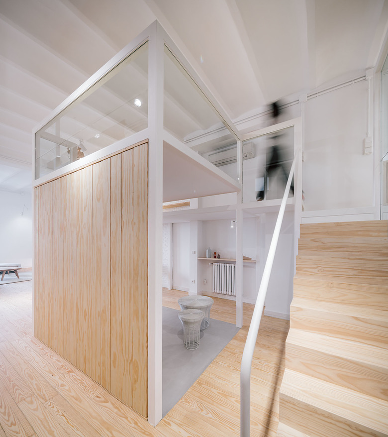Our purpose was to use the thinnest structure possible so we opted for a metallic system with an 8x8cm section, which its interior is used to contain the installations. The rest of the materials were chosen in order to mimic themselves with the wooden and existent floors and the white walls.