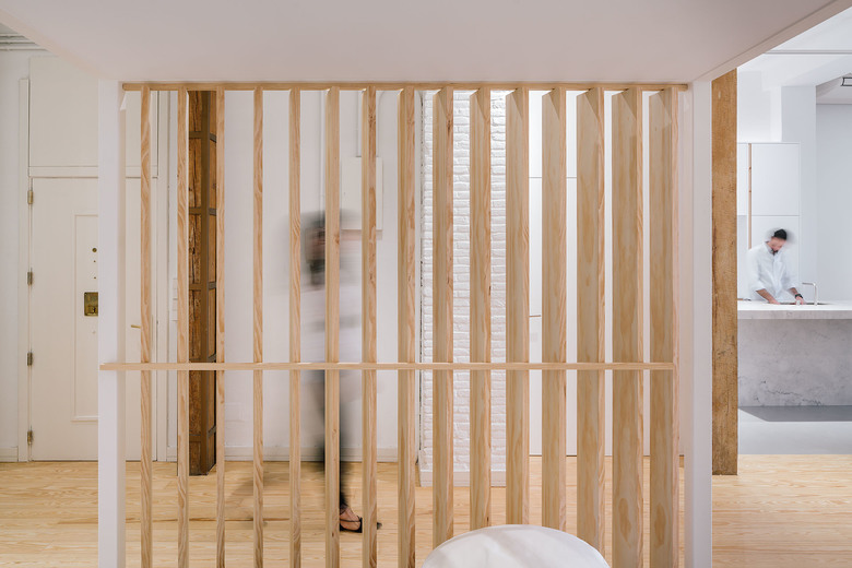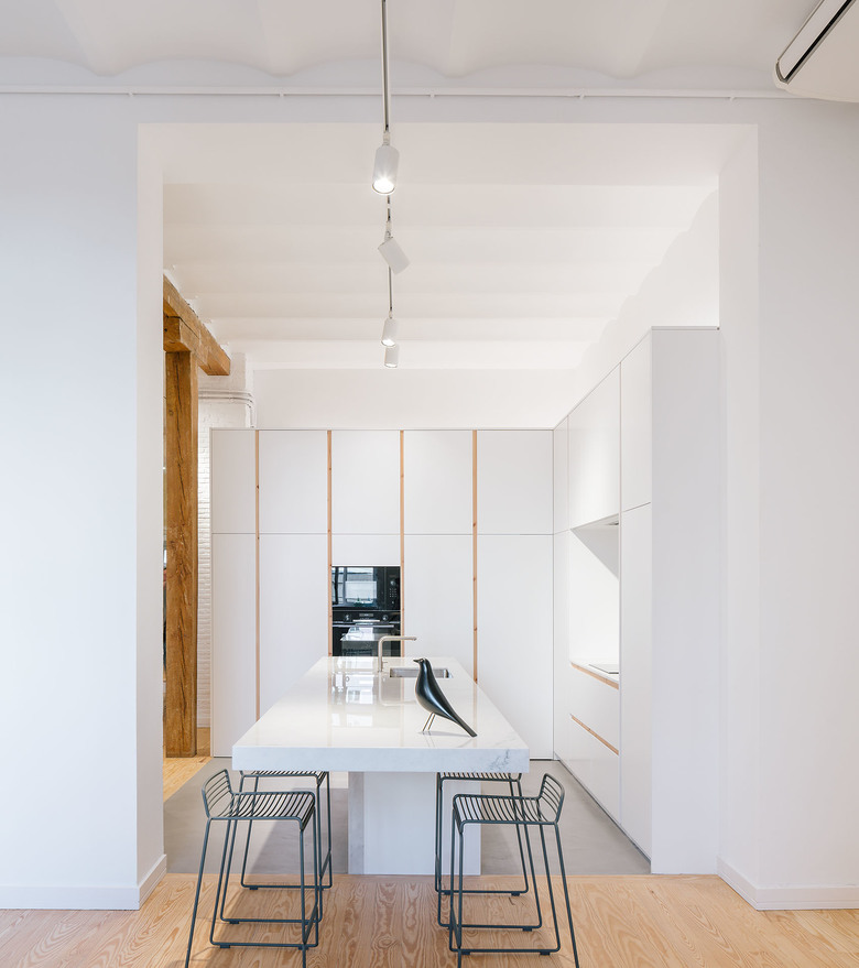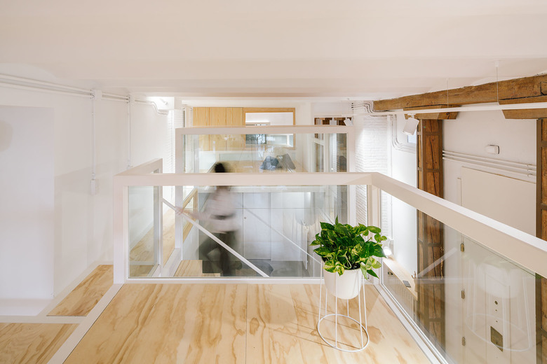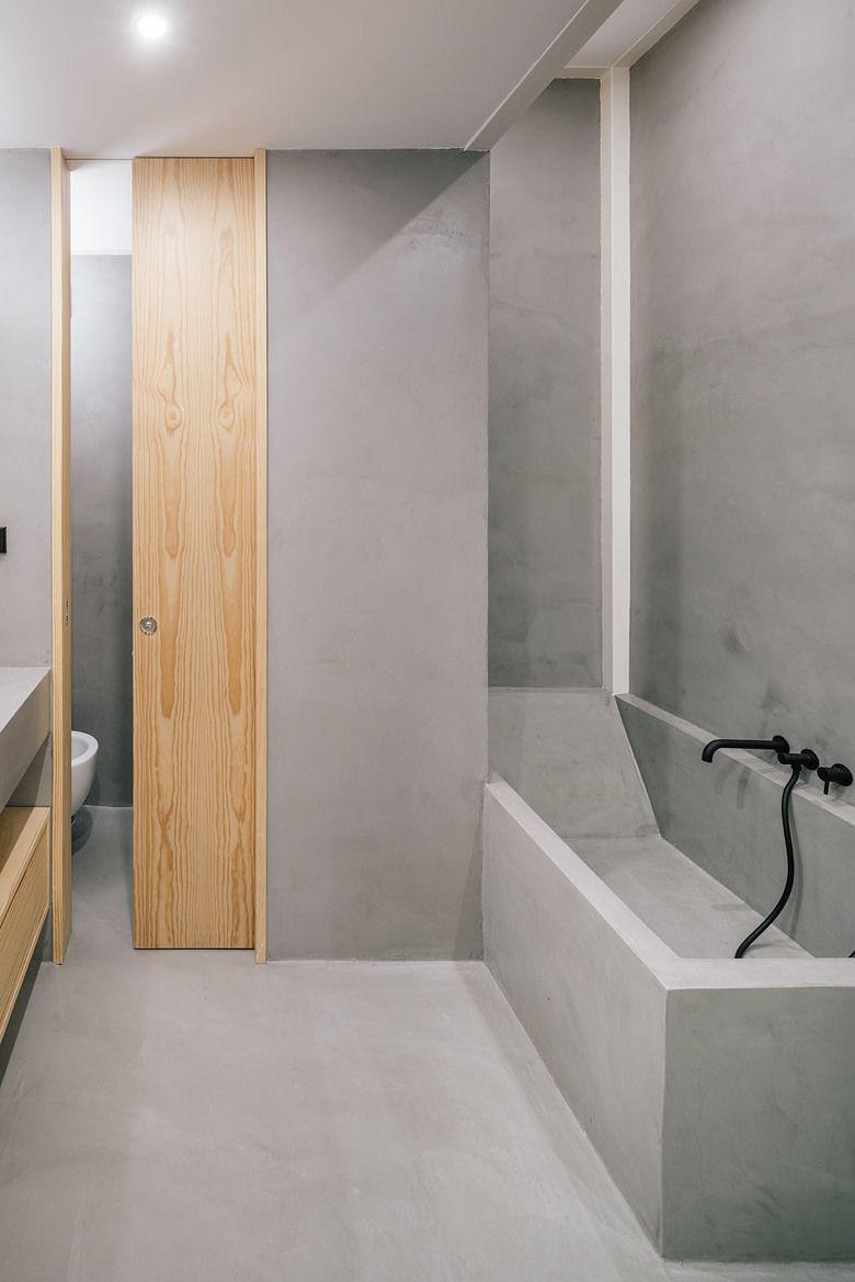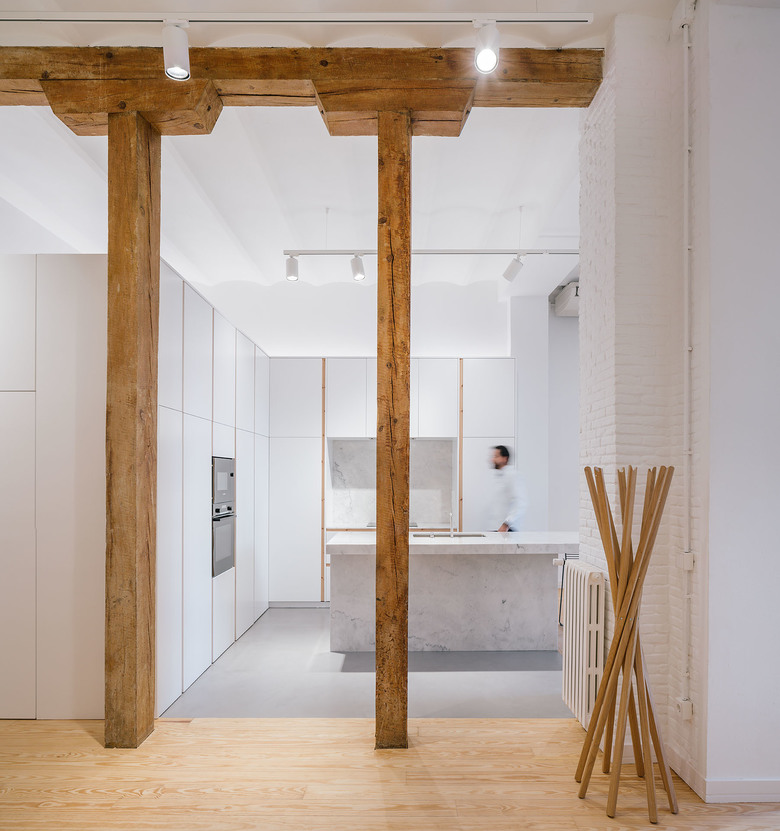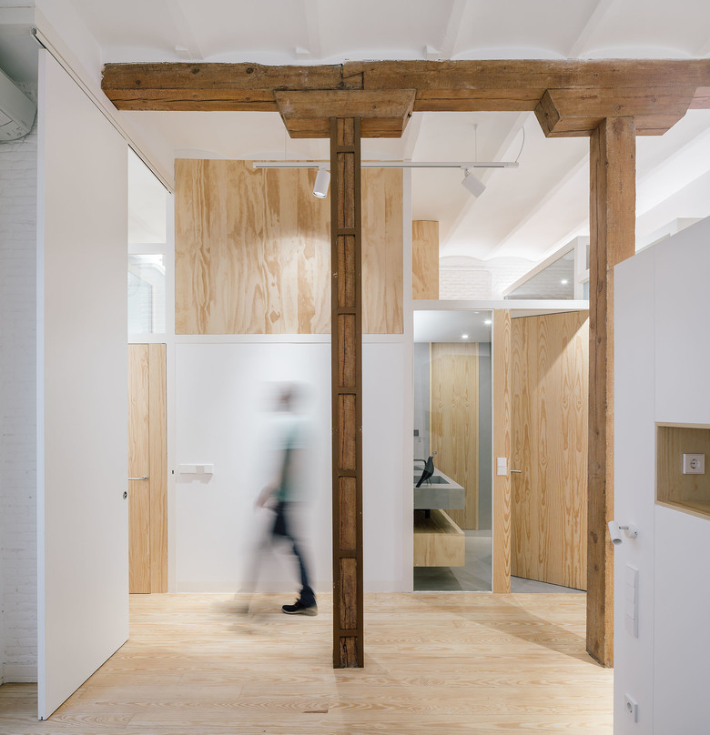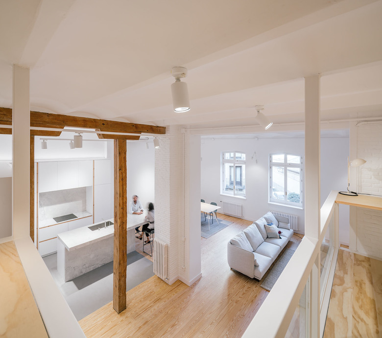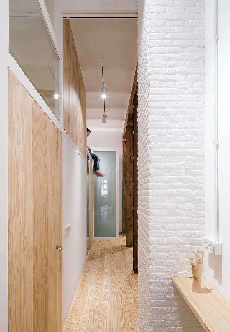 According to the materiality, we can distinguish five elements; The perimetric load-bearing wall made of clinker bricks and painted in white; The existent pinewood that constitutes the major part of the flooring and some of the enclosures of the project; The white metallic structure; The different glass surfaces and its opacity degree; and the waxed concrete, that generates a continuous surface with no joints in the humid surfaces like the kitchen floor, the bathroom floor, the sinks or the bathub.