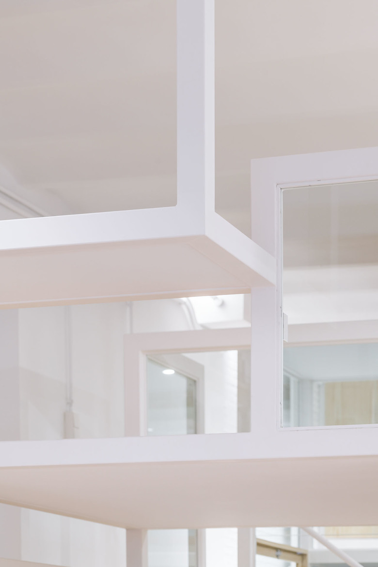 This is carried out by a metallic structure finished in white. This structure is sometimes resting on the floor and other times hanging from the ceiling and its in-between spaces are filled by wood or glass panels depending on the function they embrace. The same happens with the glass facades.