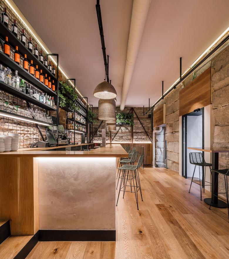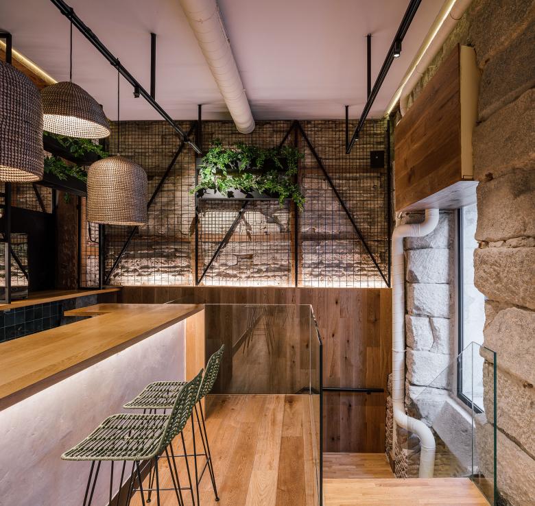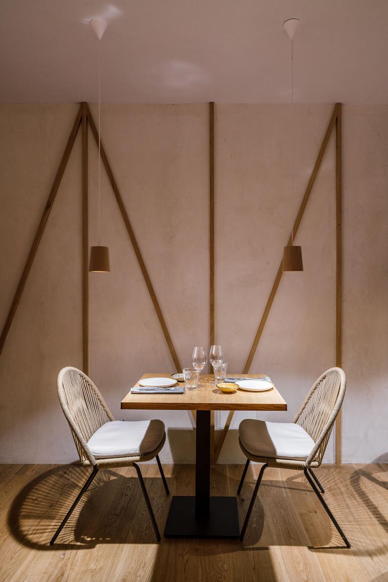 A nivel material, el proyecto se completa con acabados naturales como la madera de roble en suelos y zócalos, el yeso en paramentos verticales y en forma textil en el techo con el lino, logrando un ambiente cálido y luminoso, característica muy importante ya que el local posee poca iluminación natural.