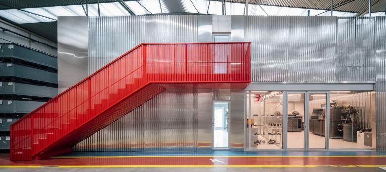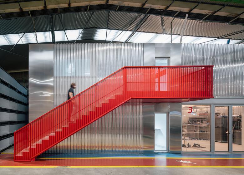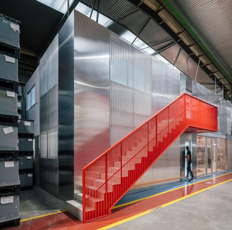 La “piel “ presenta varios tipos de acabados y perforaciones, dando respuesta a las necesidades de privacidad y aislamiento de los distintos espacios que protege, generando un manto materialmente continuo pero con variedad de texturas y brillos. El nuevo núcleo de comunicaciones se convierte en el protagonista de de esta intervención, una banda diagonal de color rojo rompe la linealidad que presenta el despiece vertical de las chapas metálicas, mientras hace un guiño al color corporativo de la empresa y al mundo de la automoción.