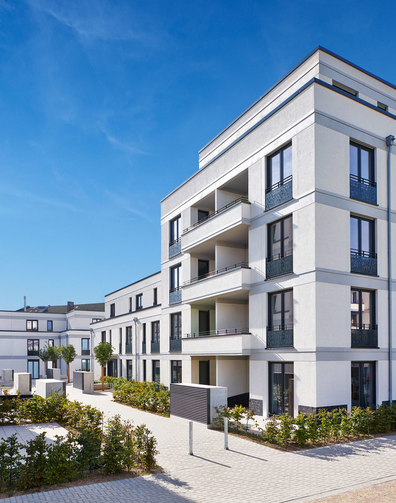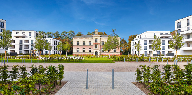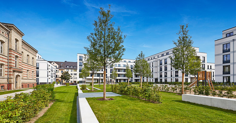 In respektvoller Distanz zum ehemaligen Lazarett wurde den Neubauten viel Freiraum gegeben. Rund um die klassisch angelegte Hoffläche ist eine autofreie grüne Insel für alle Generationen entstanden, die das Leben eines ganzen Stadtteils in Bewegung bringt.