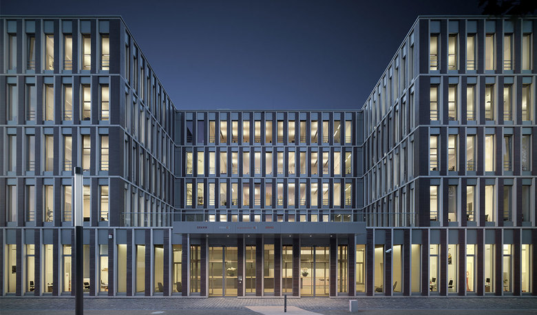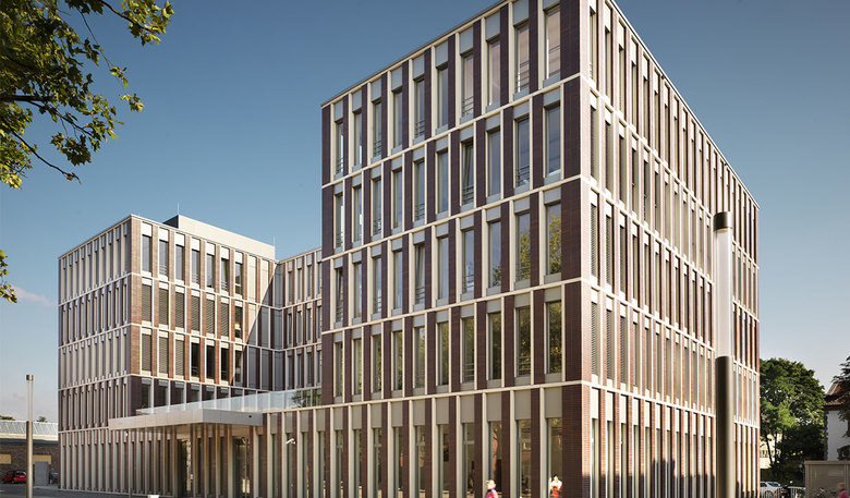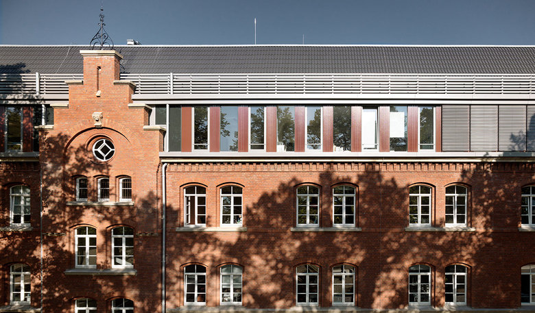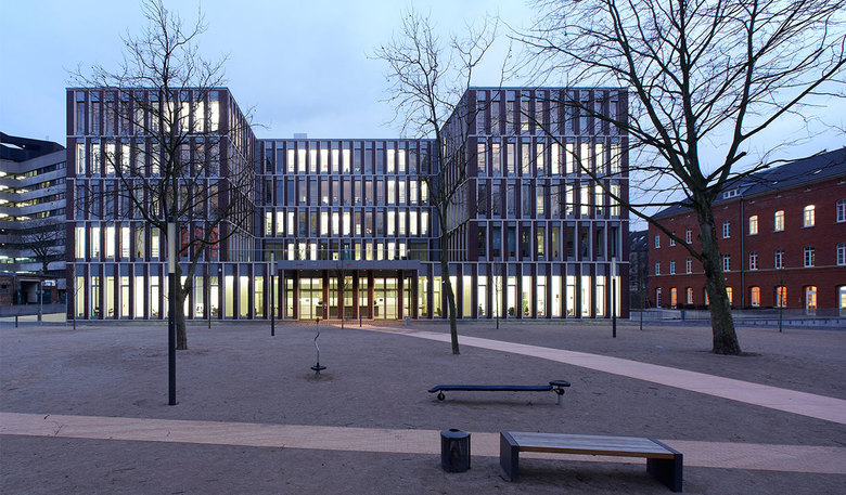 Zur Erinnerung an das steinerne Gedächtnis einer Stadt wurde legendäre preußische Disziplin im Umgang mit Fassaden und Raum sensibel interpretiert und verfremdet: Im Neubau überzeugt der spielerische Wechsel der Fassaden- und Fenstergestaltung, deren Optik sich, je nach Standpunkt des Betrachters, verändert. Die Erweiterung des Altbaus wiederum fasziniert durch den Einsatz eines „technischen Ziegelsteins“, kombiniert mit einer irisierenden, schimmernden Glasoptik.