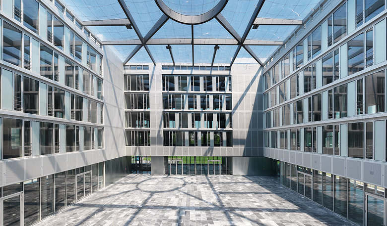 Unternehmenskommunikation hat sich in den letzten Jahrzehnten weltweit neu erfunden. Inmitten idyllischer Umgebung verweist das neue Konstanzer Headquarter eines Pharmakonzerns auf dessen Unternehmensphilosophie – Transparenz und Weltoffenheit. Der Panoramablick über die Bodenseelandschaft wurde in die Arbeitswelt und den Arbeitsprozess gestalterisch einbezogen. So scheint die feingliedrige Landschaft optisch unberührt und das Gebäude selbst durch die Transparenz und Erhöhung des Erdgeschosses in einen permanenten Schwebezustand versetzt. Namensgebendes Element der Architektur ist die elegante, neuartige Glaslamellenfassade, die wie ein zarter Schleier für Sonnenschutz sorgt und dennoch den Blick ungestört schweifen lässt. Die erhabene Sicht über die Landschaft – unverbaut und frei - gehört dem Mitarbeiter.