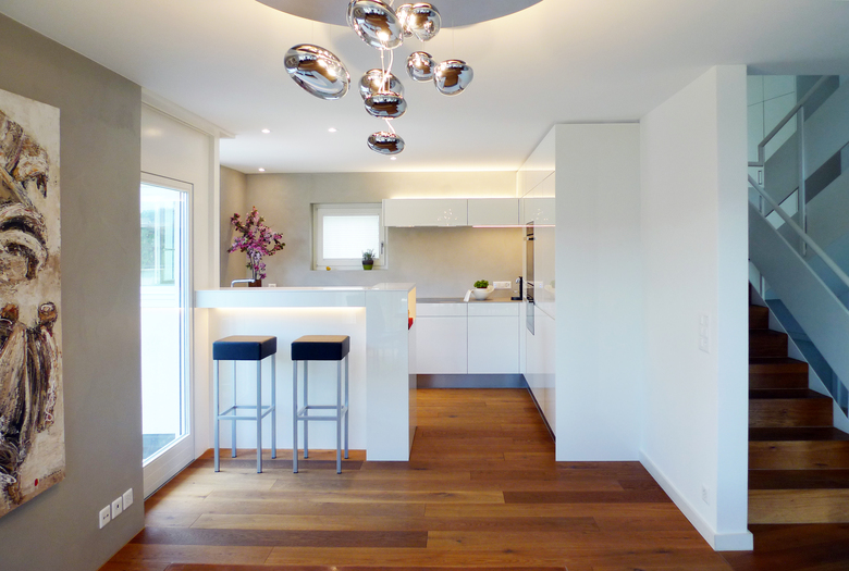 Die alte Beleuchtung wurde durch dimmbare LED-Lampen und Spots ersetzt. Der Bodenbelag wurde mit Parkett ergänzt, um die Verbindung zu den anderen Räumen zu betonen. Der Rückbau der Trennwand ermöglichte die Realisierung eines Bartischs für das Frühstück. Die alten Wandplatten aus Naturstein wurden entfernt und durch eine fugenlose Beschichtung ersetzt.