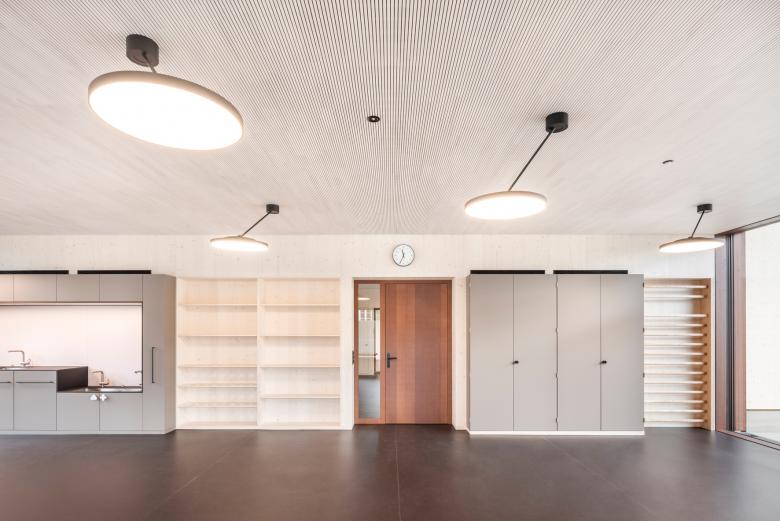 Seitlich befinden sich nutzungsflexible Haupträume. Der mittlere Teil mit den Nebenräumen und Garderoben verbindet die beiden Haupträume mit dem Aussenbereich. Im Süden bilden die markanten Vordächer einen gedeckten Spielraum und beschatten gleichzeitig die vollverglasten Fassaden.