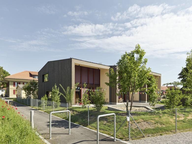 Der Neubau wird neben den bestehenden Kindergarten platziert und übernimmt dessen Gliederung. Durch die Aufteilung der Nutzung in drei gestaffelte Volumen wird eine Verträglichkeit im Massstab erreicht und das Schulhaus als Hauptgebäude respektiert. Im Zentrum zwischen dem Schulhaus und dem Neubau entsteht ein grosszügiger Pausenplatz.