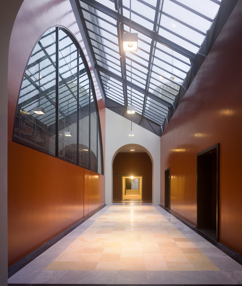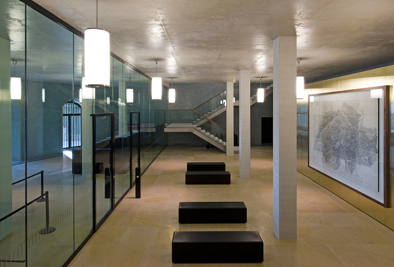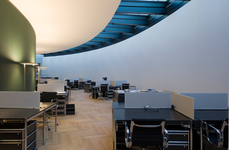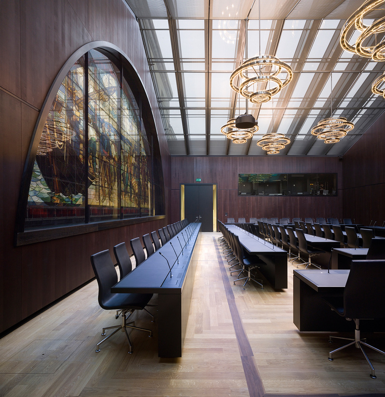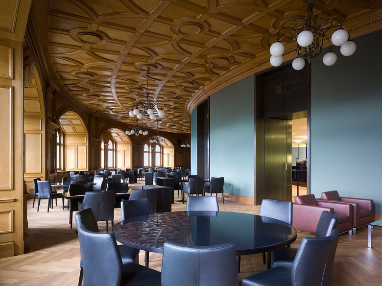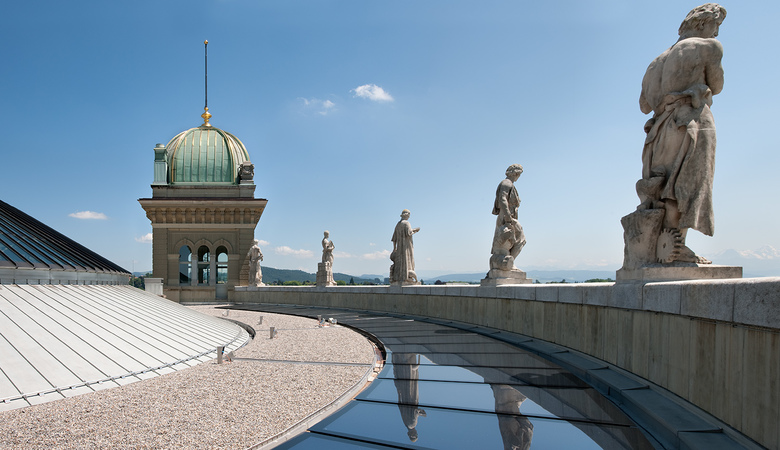 Im Geschoss um die grosse Kuppel herum entstanden modernste Konferenz-, Sitzungs- und Büroräume, die dank der grossen Oberlichter lichtdurchflutet sind, zugleich aber eine neue Sicht auf die Kuppel gewähren. Hier lassen sich die im ganzen Haus angestrebte Verbindung und das Gleichgewicht von Alt und Neu am deutlichsten erleben. Die Haustechnik konnte an einem neu geschaffenen Standort zentralisiert werden. So ergab sich die Möglichkeit, von der Bundesterrasse her einen repräsentativen Publikumseingang zu schaffen. Dadurch erhält die südliche Bundesterrasse mit der reich gestalteten Südfassade des Gebäudes eine neue Bedeutung.