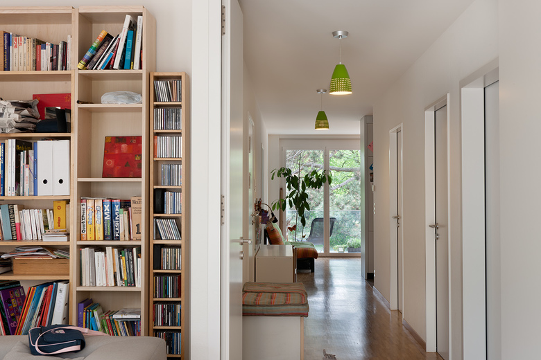Das Prinzip der Wohnungen basiert auf einem durchgehenden, diagonal durch die Gebäudetiefe verlaufenden offenen Raum, an welchem Zellen von jeweils zwei Zimmern angedockt werden. Diese Zimmer können den einzelnen Wohnungen flexibel zugeteilt werden. Der durchgehende Raum, der sich an den beiden Enden jeweils verbreitert, verbindet Ess- und Wohnbereich und ermöglicht die Orientierung auf beide Seiten des Gebäudes, ohne störende Zwischenwände. Auf diese Weise werden auch die Verkehrsflächen zu Gunsten des nutzbaren Raumes auf ein Minimum reduziert.
