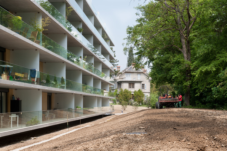 Der parkartige Charakter des Geländes dient als Ausgangspunkt für das Projekt. Die beiden neuen Gebäude bilden einen länglichen, von den zwei bestehenden Baumreihen flankierten grosszügigen Aussenraum, welcher den sozialen Austausch zwischen den Bewohnern der Gebäude unterstützt. Das Erdgeschoss der beiden in den Park gesetzten Baukörper ist gegenüber dem Terrain um einen Meter angehoben, um die Privatsphäre der in diesem Geschoss gelegenen Wohnungen zu garantieren. Aus dem zentralen Aussenraum werden sämtliche Treppenhäuser erschlossen, was den Raum belebt und seine Funktion als Herz der Anlage verstärkt.