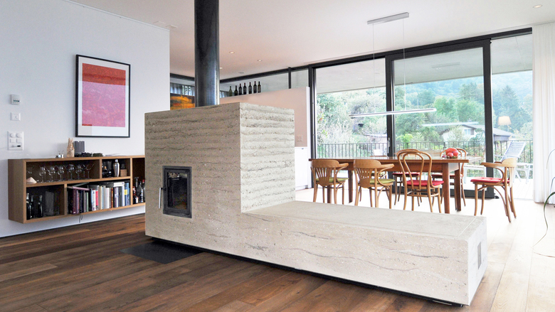 Grundsätzlich gliedert sich das Gebäude in ein Wohngeschoß und ein Schlafgeschoß mit Atelier. Über die steile Zugangsstraße vom Ort herauf betritt der Besucher das Haus im Wohngeschoß. Eine großzügige Eingangshalle mit Verglasung auf die Südterrasse teilt das Wohnhaus in einen öffentlichen und einen privaten Bereich. Der Wohnraum und die Küche wurden bewusst sehr offen gehalten, um das direkte Sonnenlicht bis in die nördlichen Zonen eindringen zu lassen. Je nach Tageszeit werden die verschiedenen Außenbereiche genutzt. Die privaten Räume der Bauherren befinden sich ebenfalls im Wohngeschoß mit Blick auf den Walensee.