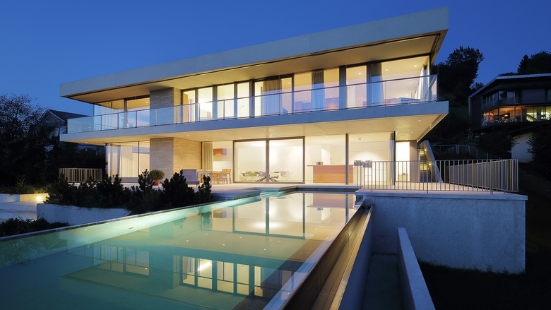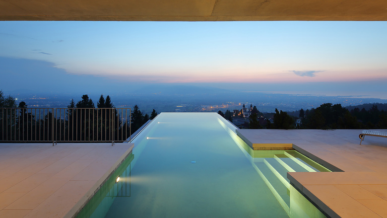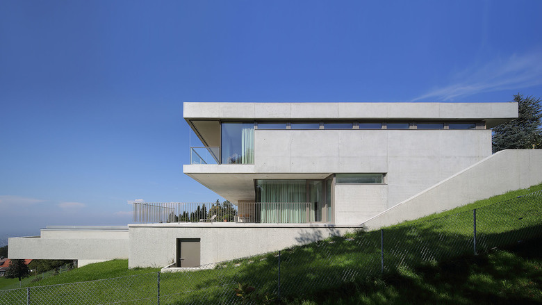Das steile Grundstück Richtung Westen befindet sich oberhalb des Dorfkerns der Gemeinde Bildstein an einer kleinen privaten Zufahrtstraße. Dem Geländeverlauf folgend wurde das Haus in einen Schlaf- und einen Wohnbereich eingeteilt. Bewusst geschlossen präsentiert sich die Eingangshalle im Obergeschoß. Die nussholzfurnierte Wand auf der Galerie beinhaltet die Zugänge zu den privaten Zimmern des Bauherrn, sowie zu einem Gästetrakt im Süden. Von der Galerie im Obergeschoß führt die einläufige Steintreppe hinunter in das Wohngeschoß. Von hier aus eröffnet sich dem Besucher ein wunderbarer Blick über das gesamte Rheintal und den Bodensee. Ein offenes Wohnkonzept beinhaltet die Lebensräume Essen & Wohnen, der Kamin und das Wohnzimmer liegen auf der privateren Nordseite. Hier wurde auch keine raumhohe Glasfassade ausgeführt. Vielmehr wird der Blick Richtung Bodensee gerahmt durch die niedere Brüstungshöhe auf Sitzhöhe. Besonderes Augenmerk legte der Bauherr auf die Terrasse, hier ist der 13m lange, auskragende Pool der absolute Blickfang. Kein Geländer stört den Blick ins Tal, der umlaufende schmale Servicegang wurde so angelegt, dass er beim Schwimmen und auf der Terrasse nicht zu sehen ist: Wasseroberfläche und Himmel verschmelzen zu einer Einheit. Ebenso bleibt der Ausblick frei von Absturzsicherungen durch geschickt abgetreppte Pflanztröge aus Beton.