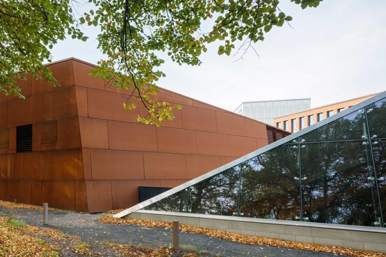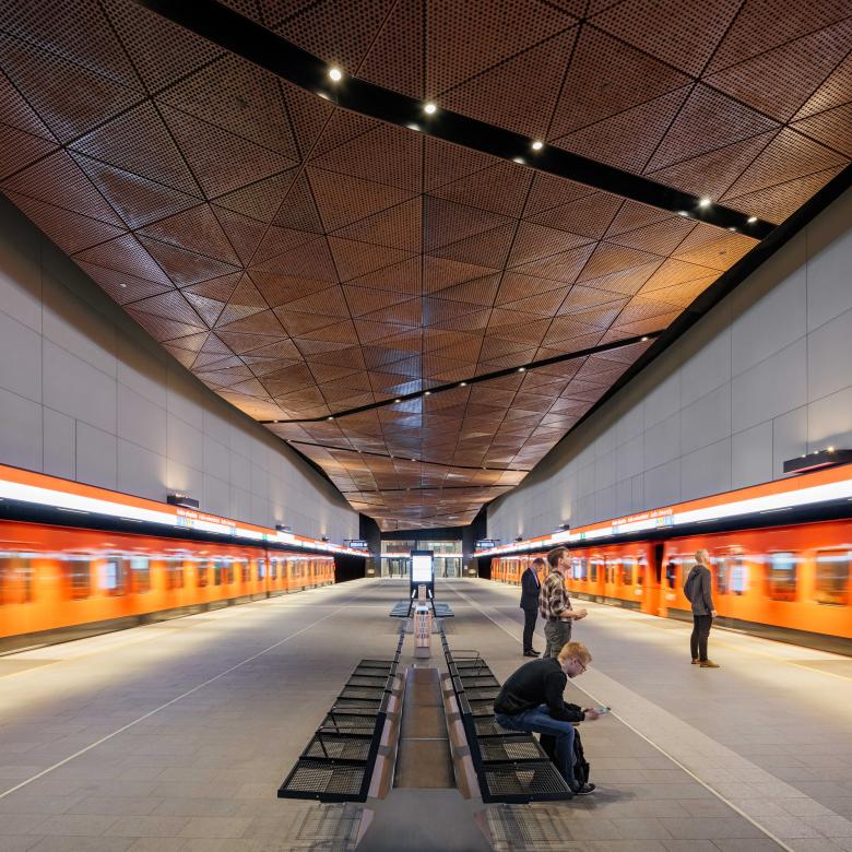 Among other design decisions, the Aalto University station distinguishes itself from the other stations along the metro route through its rich material palette. The palette has been picked as to avoid gloss, and to emphasize natural materiality. The station’s lowered ceiling is made of Cor-ten steel panels. The faceted ceiling flows through the main entrance, to the platform level and up to the secondary entrance on Tietotie street. It visually connects all the public areas of the station, and relates to the surrounding red brick environments with its color. Aged dark copper sheet cladding, grey granite and Cor-ten sheets form the basis of the material palette for the above ground parts of the entrance pavilions. Visible structures are reduced in the entrance space with an engineered, athletic, light form reminiscent of origami. Daylight is brought down to the platform level via an escalator shaft that terminates with a view towards the lime alley of the Otaniemi Mansion.