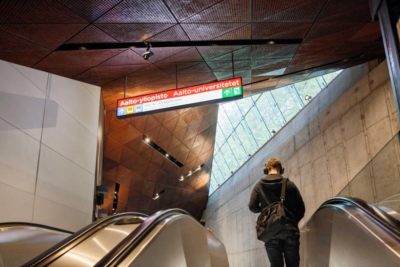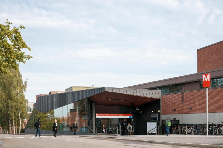 The Aalto University metro station completed in the first extension phase, resides in the heart of the university campus in Otaniemi. Its main entrance opens straight towards the former university main building, designed by Alvar Aalto.